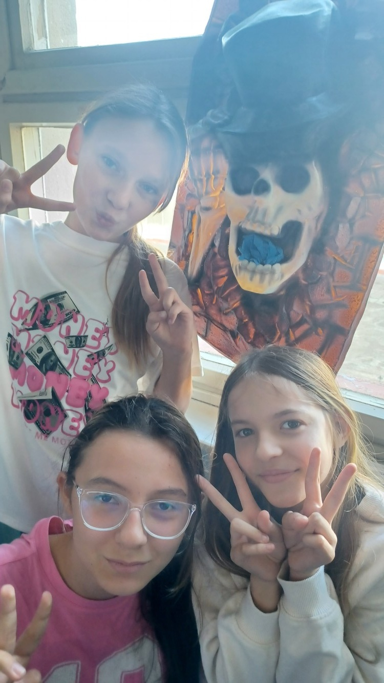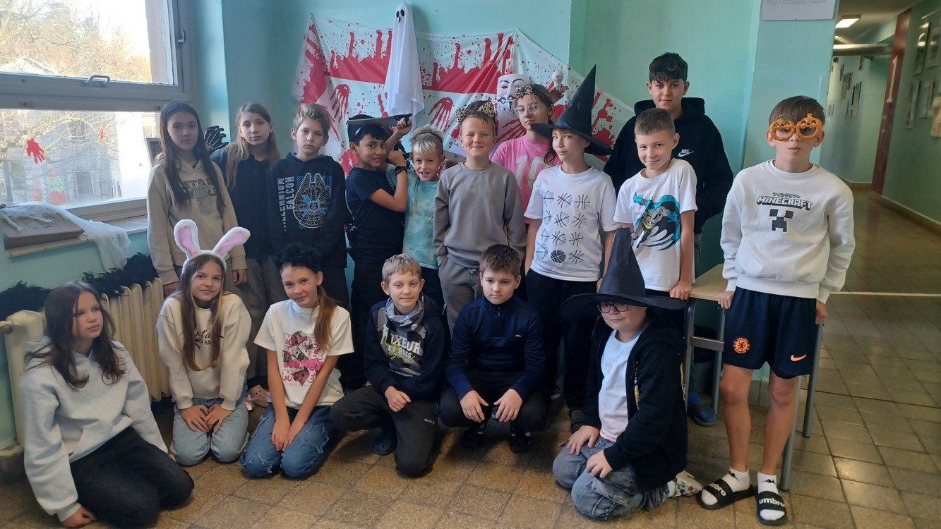 Přestože jsme páteční halloweenský den věnovali projektu, stihli jsme se alespoň společně vyfotit ve fotokoutku, který připravily děti ze školního Parlamentu.