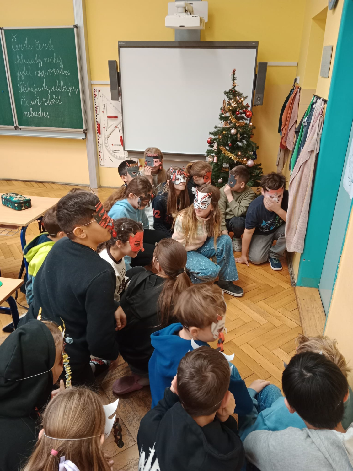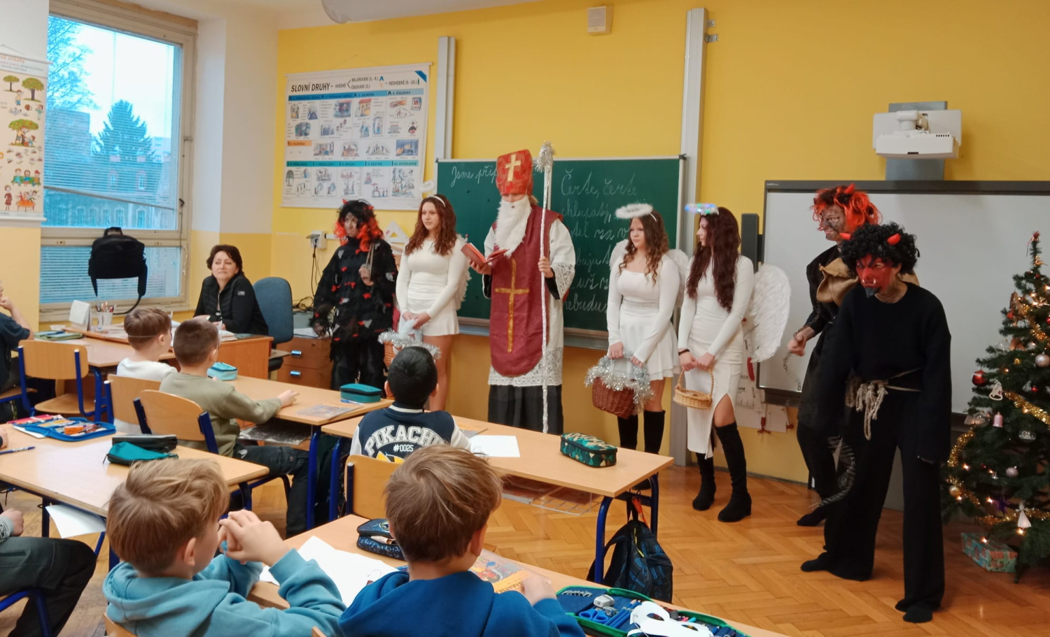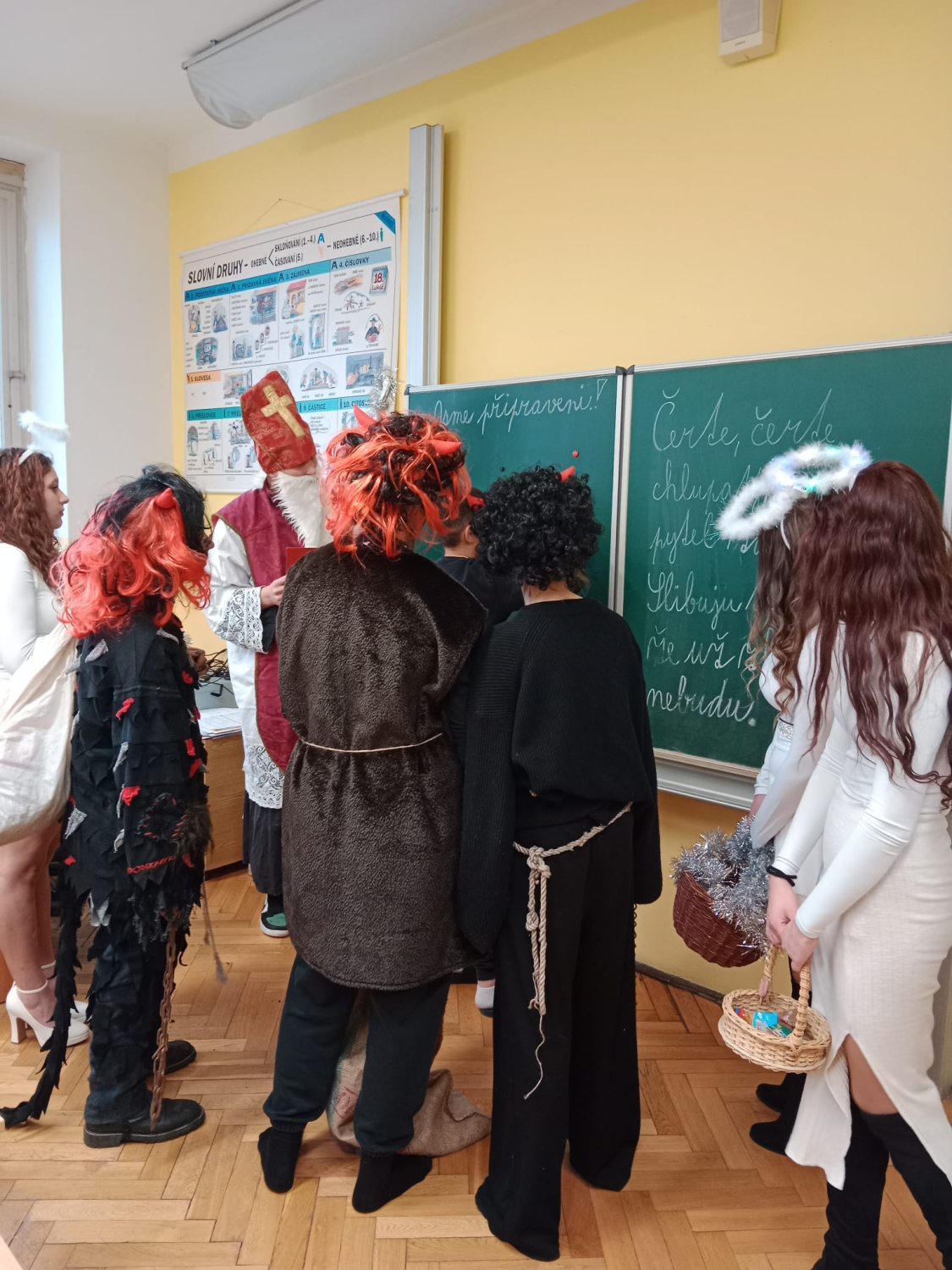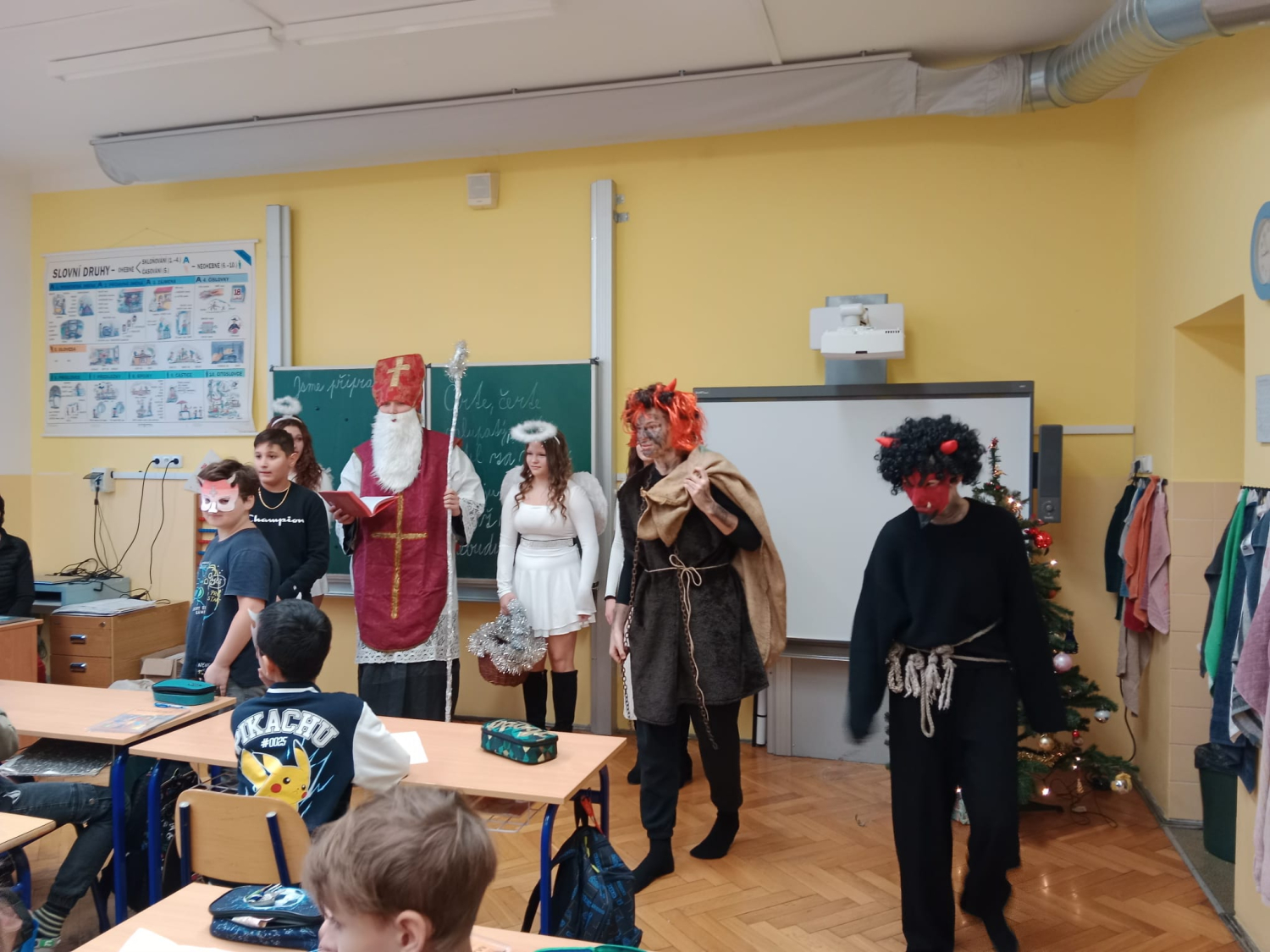 Dnes nás svou návštěvou potěšil Mikuláš se svou družinou. My jsme se ale na čerty připravili, vyrobili jsme si čertí masky a čerty s Mikulášem jsme pěkně vylekali. Někteří žáci skončili u čerta v pytli, Marek se ale nedal a před čerty utíkal, takže jsme byli svědky pořádné honičky mezi lavicemi. Moc jsme se všichni nasmáli.
