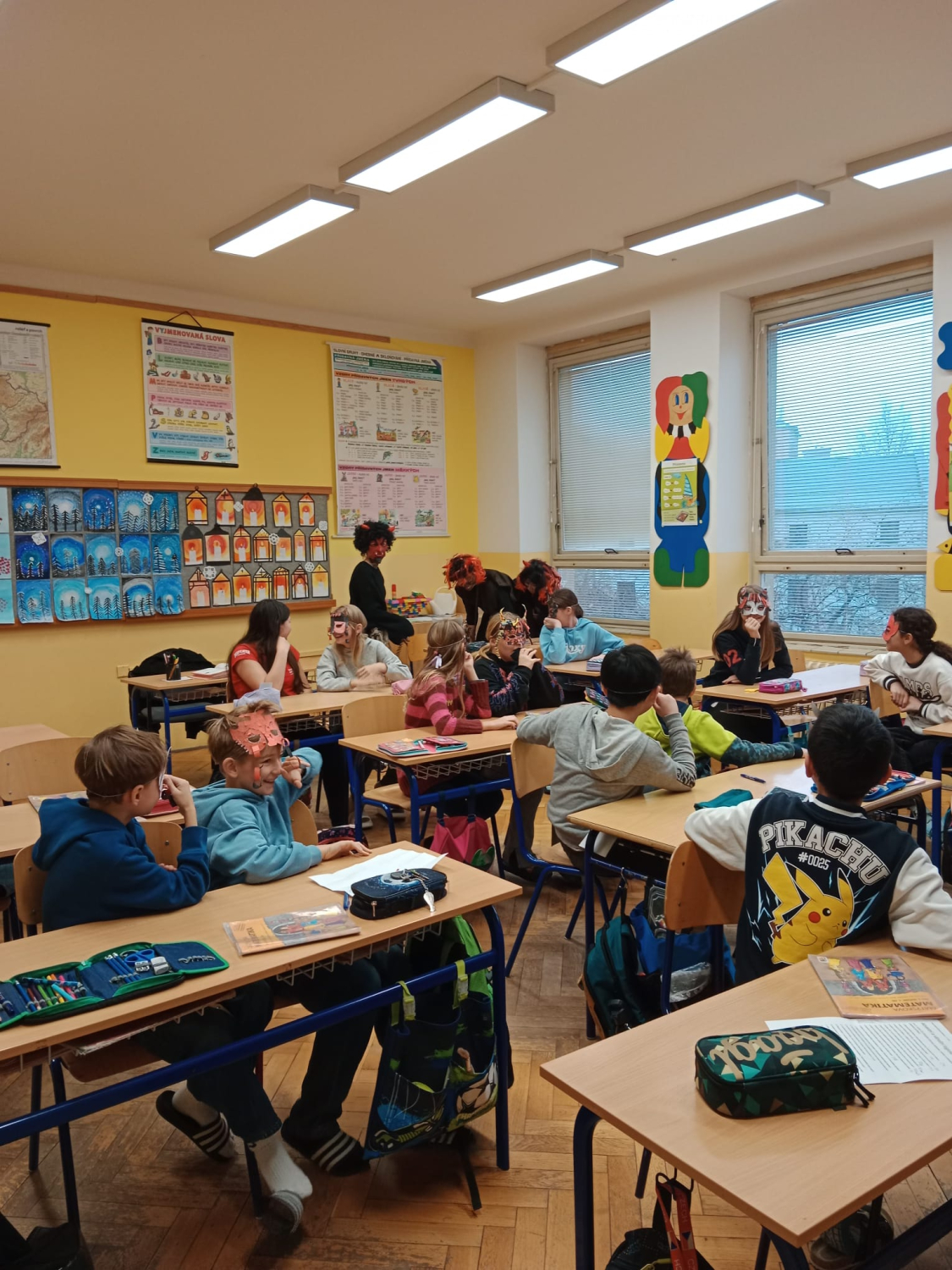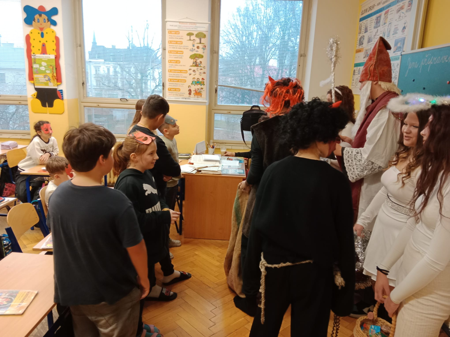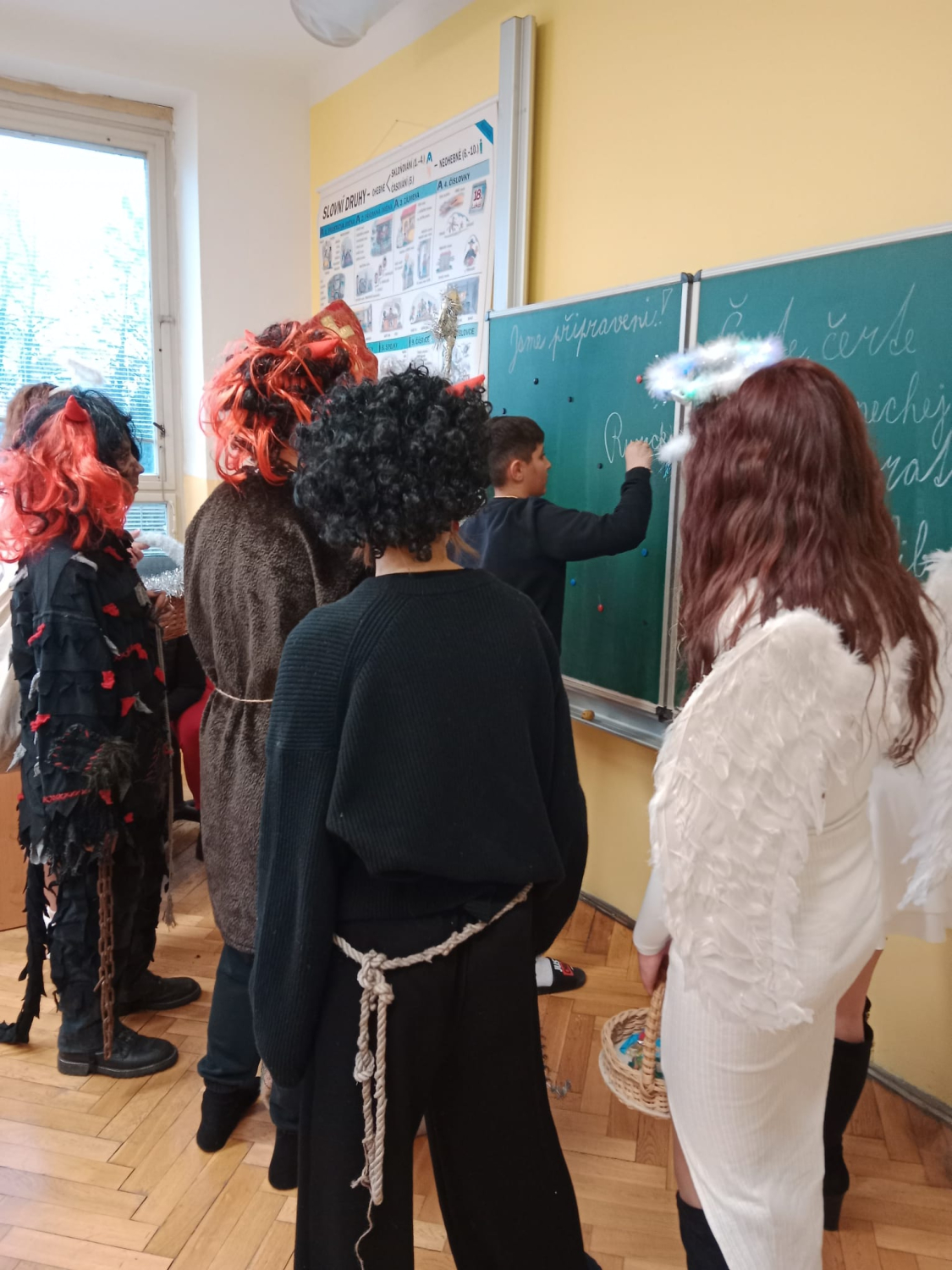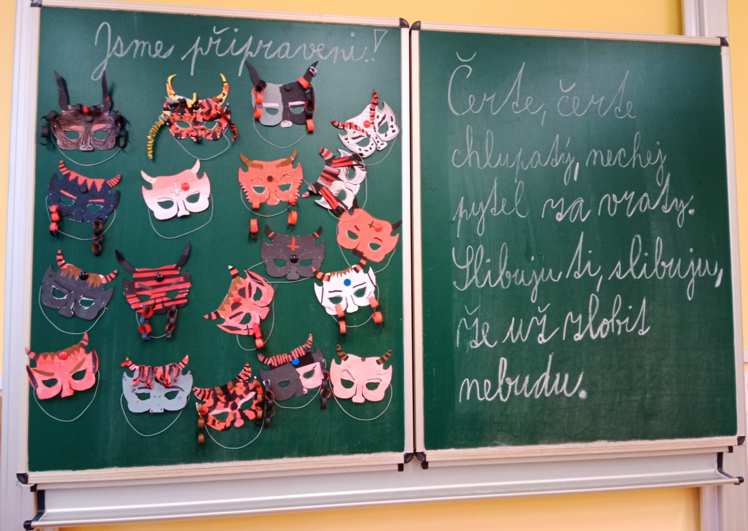 Dnes nás svou návštěvou potěšil Mikuláš se svou družinou. My jsme se ale na čerty připravili, vyrobili jsme si čertí masky a čerty s Mikulášem jsme pěkně vylekali. Někteří žáci skončili u čerta v pytli, Marek se ale nedal a před čerty utíkal, takže jsme byli svědky pořádné honičky mezi lavicemi. Moc jsme se všichni nasmáli.