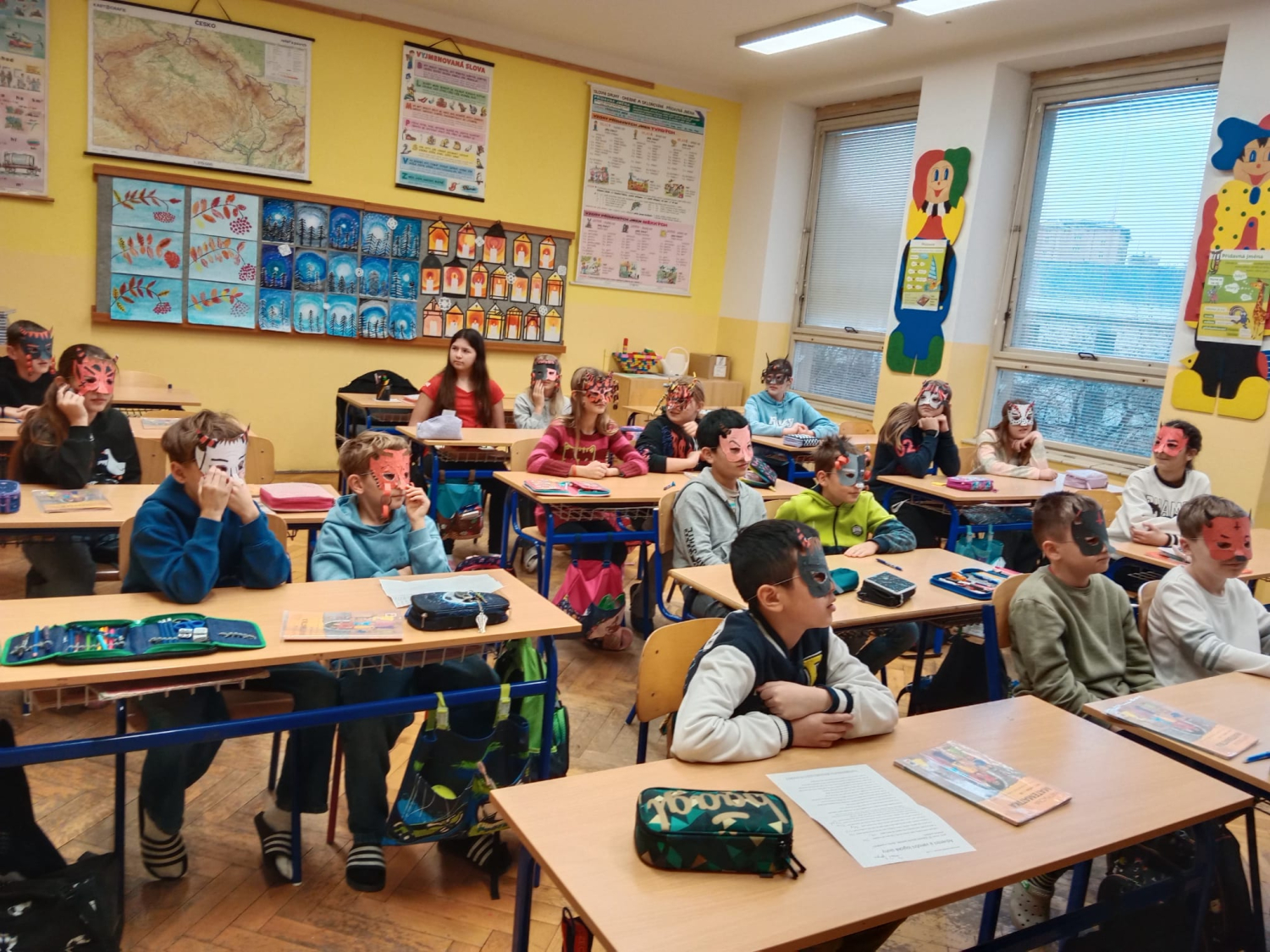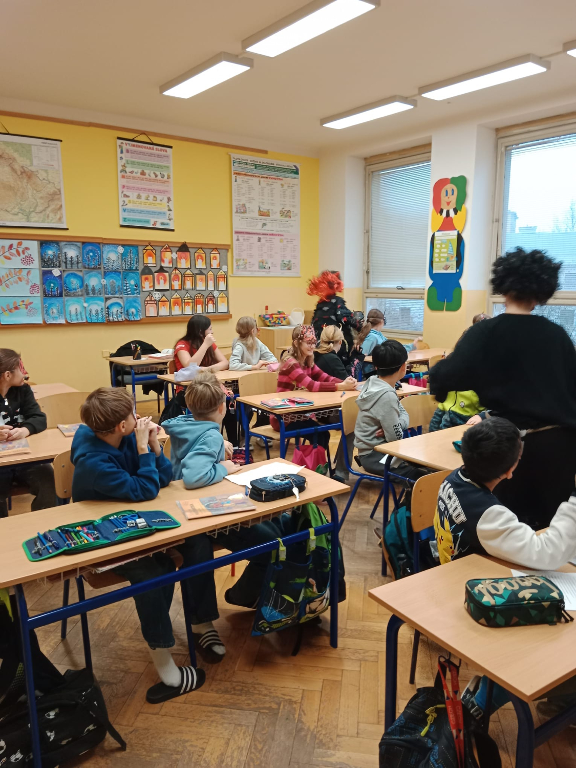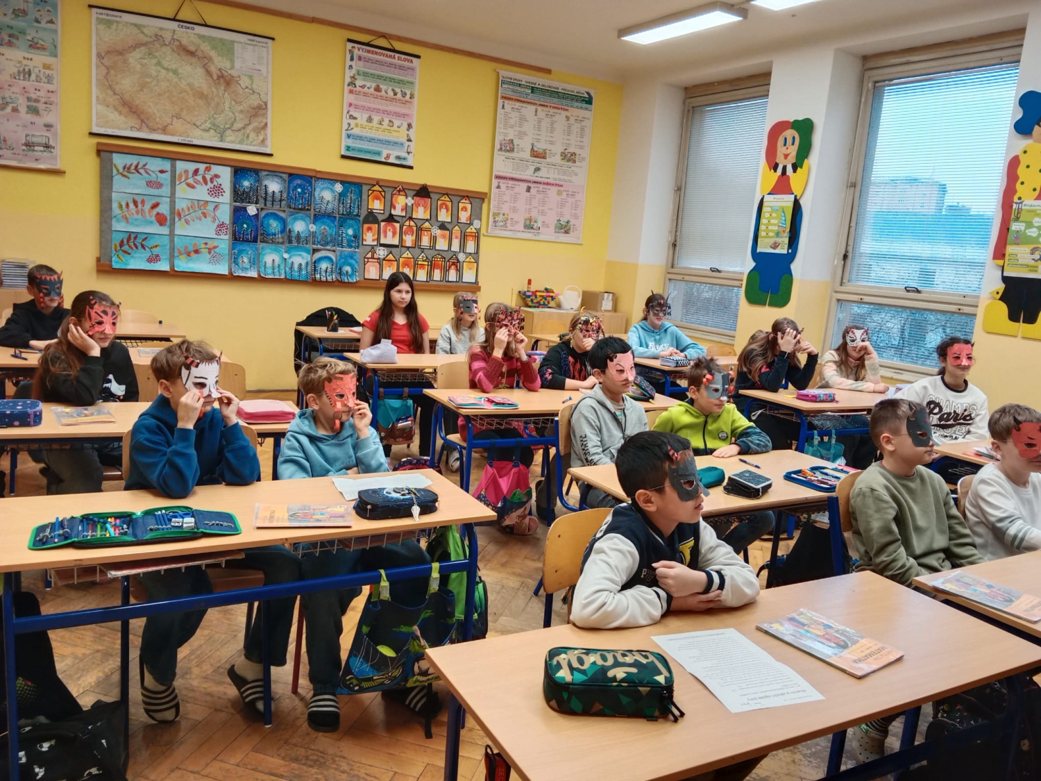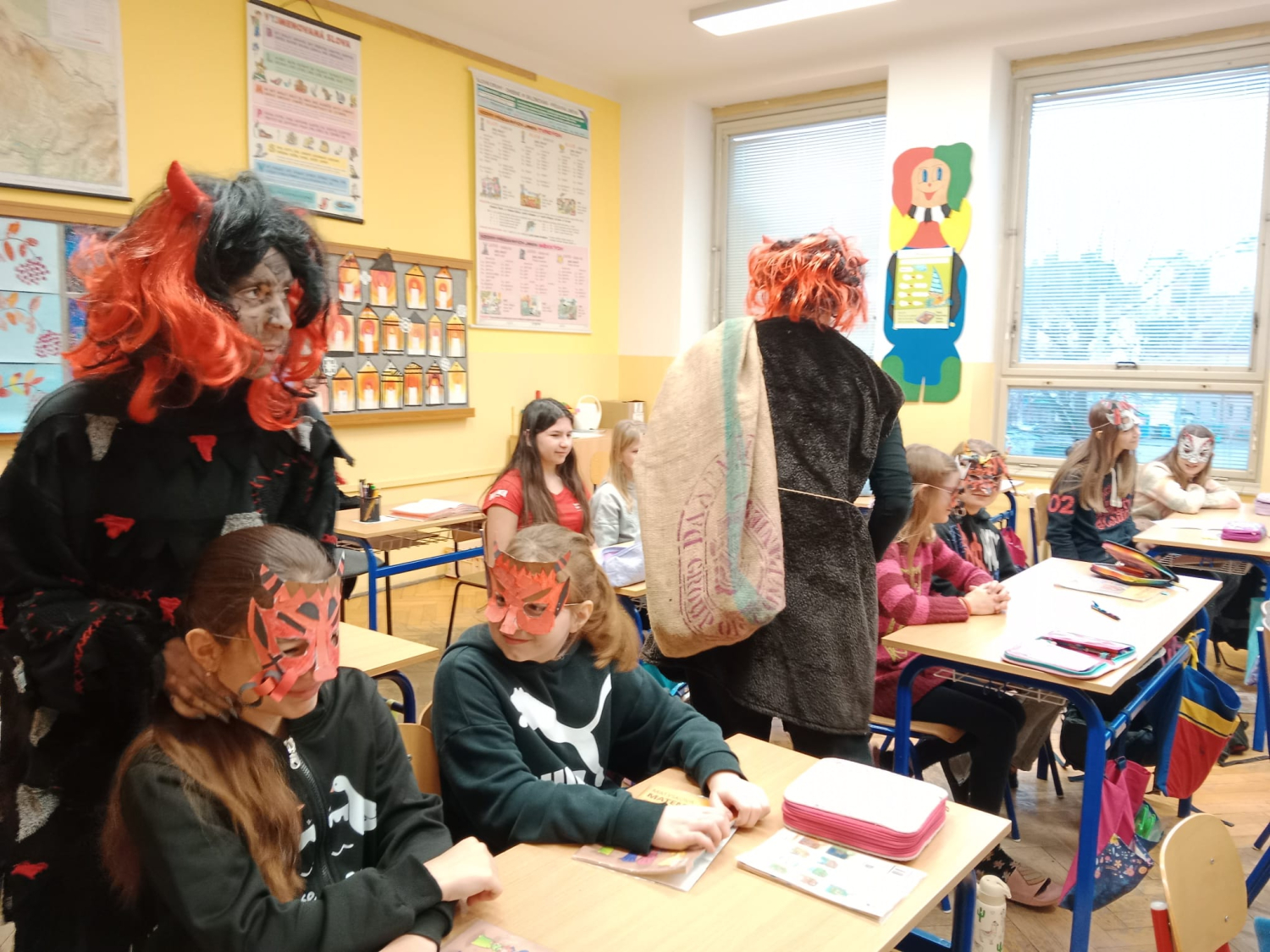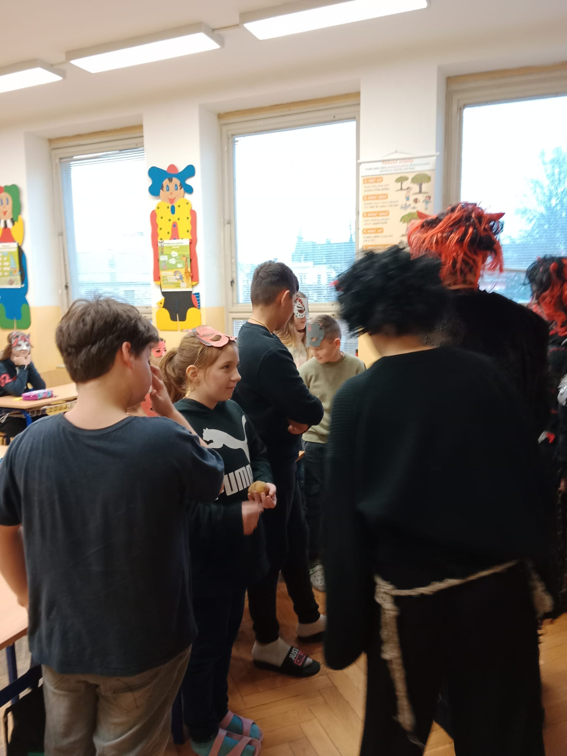Dnes nás svou návštěvou potěšil Mikuláš se svou družinou. My jsme se ale na čerty připravili, vyrobili jsme si čertí masky a čerty s Mikulášem jsme pěkně vylekali. Někteří žáci skončili u čerta v pytli, Marek se ale nedal a před čerty utíkal, takže jsme byli svědky pořádné honičky mezi lavicemi. Moc jsme se všichni nasmáli.