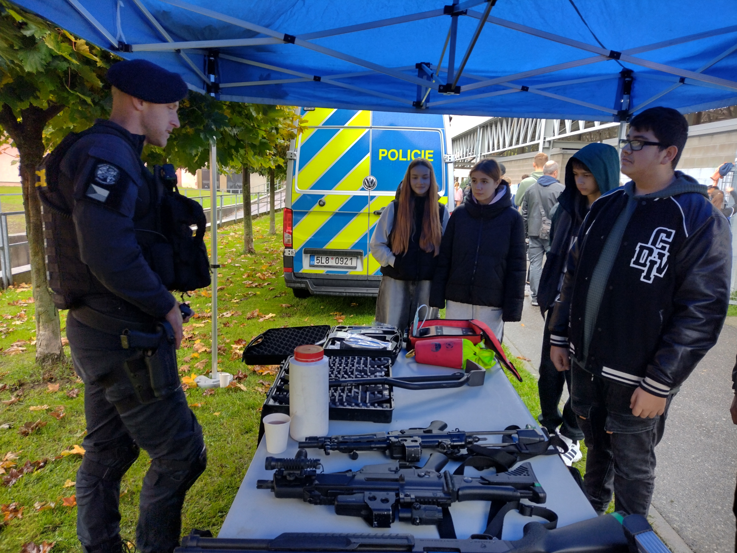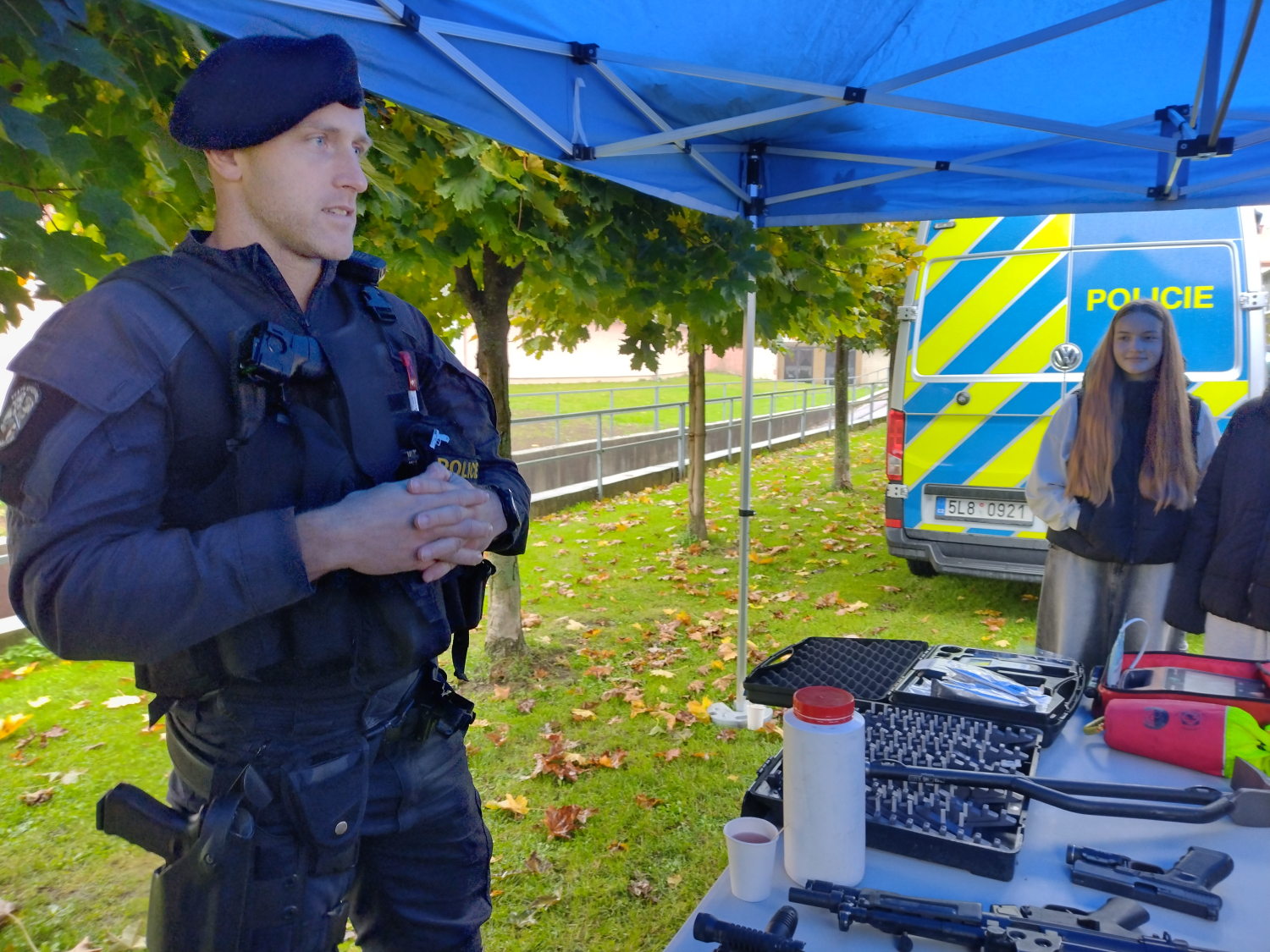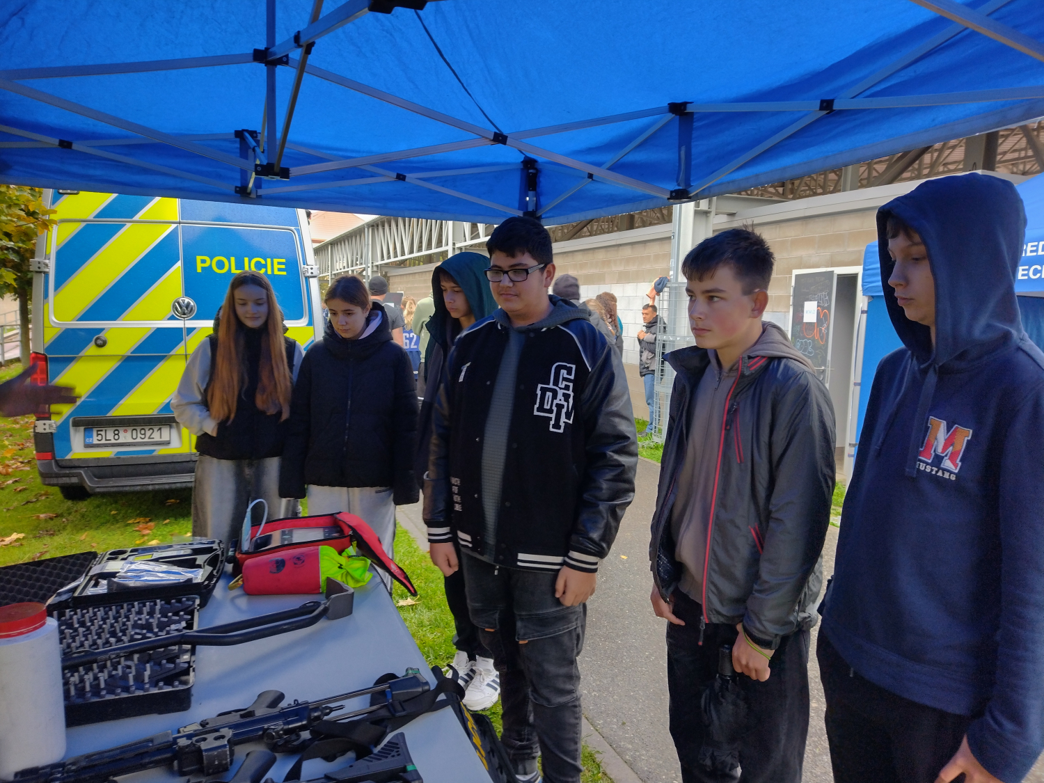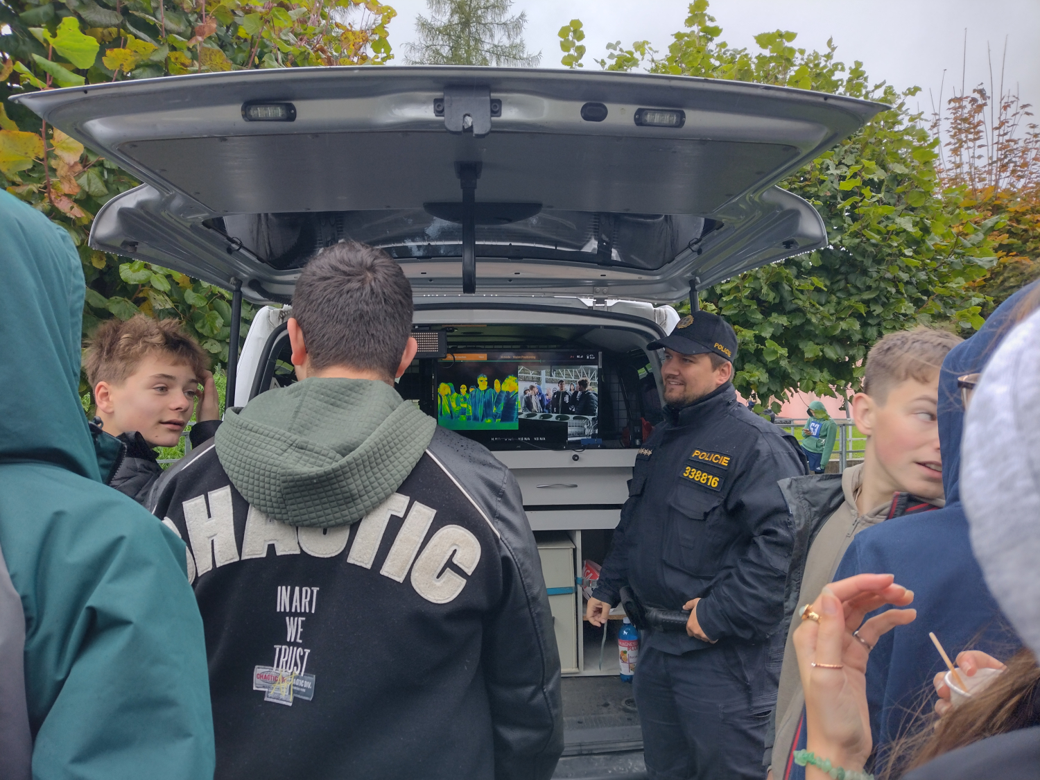 Ostatní si zatím mohli prohlédnout různé policejní složky, které se tady představily. Mezi nejzajímavější patřily určitě drony, sledovací zařízení, policisté na koních nebo zbraně. Zajímavý byl i "test" o trestní zodpovědnosti, kdy ne všichni uměli správně odpovědět na otázky, kdy se jedná o trestný čin a kdy jen o přestupek. Celou akci nám znepříjemnilo studené a deštivé počasí, přesto si každý mohl odnést hodně zajímavých informací.