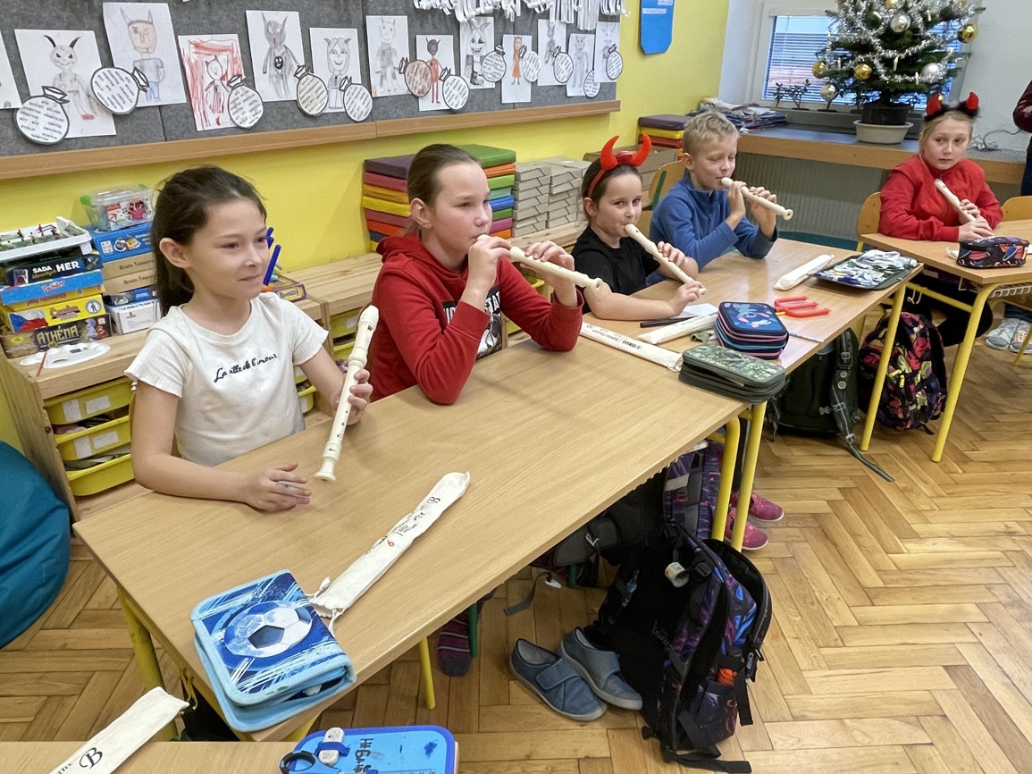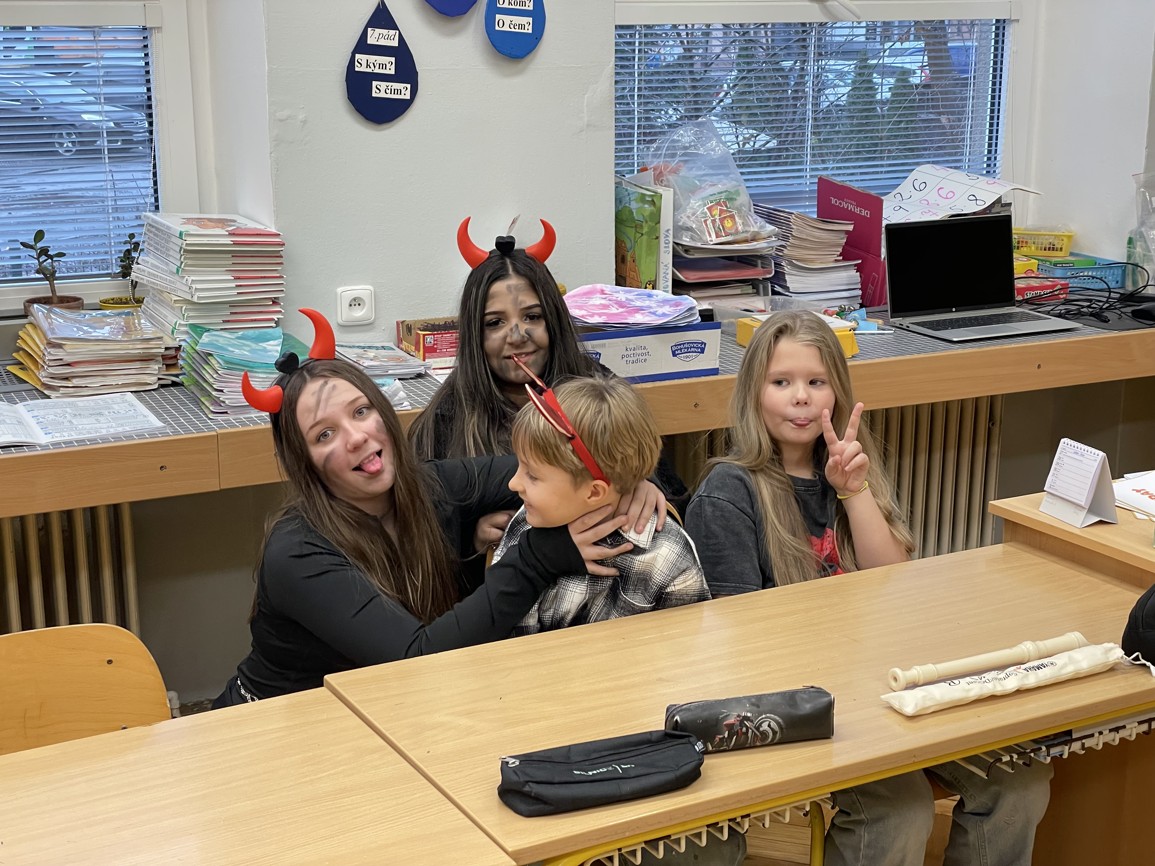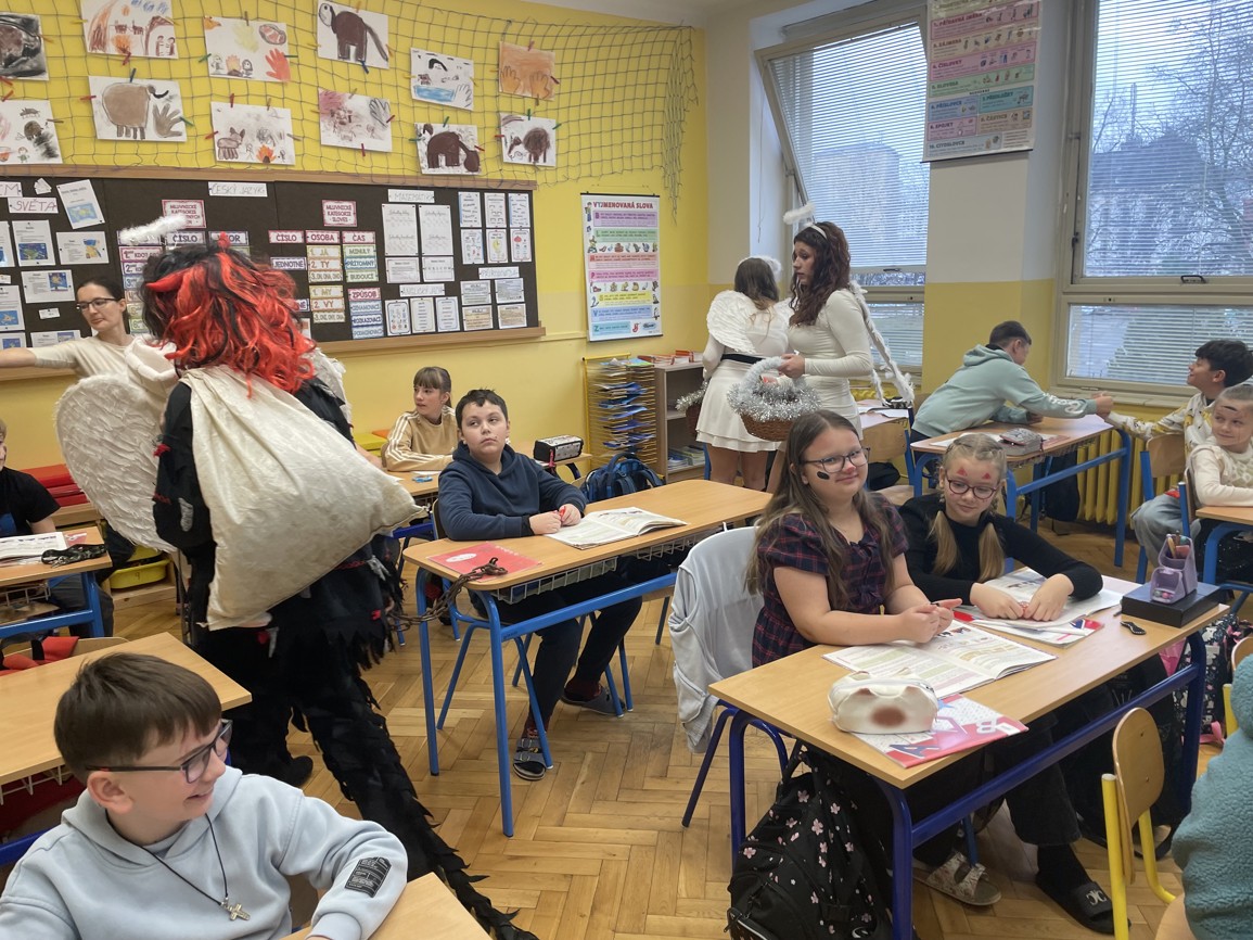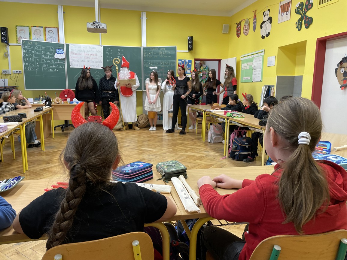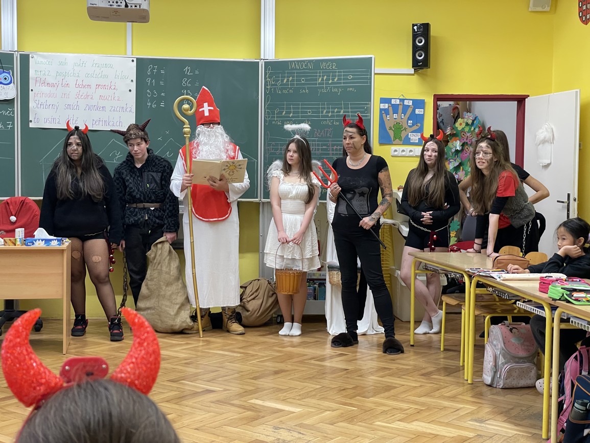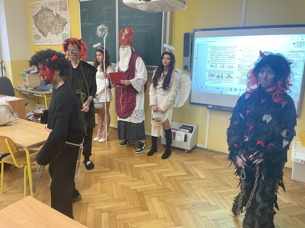 V pátek 5. prosince 2025 se v naší škole jako každý rok skupina deváťáků proměnila v postavy Mikulášů, čertů a andělů.