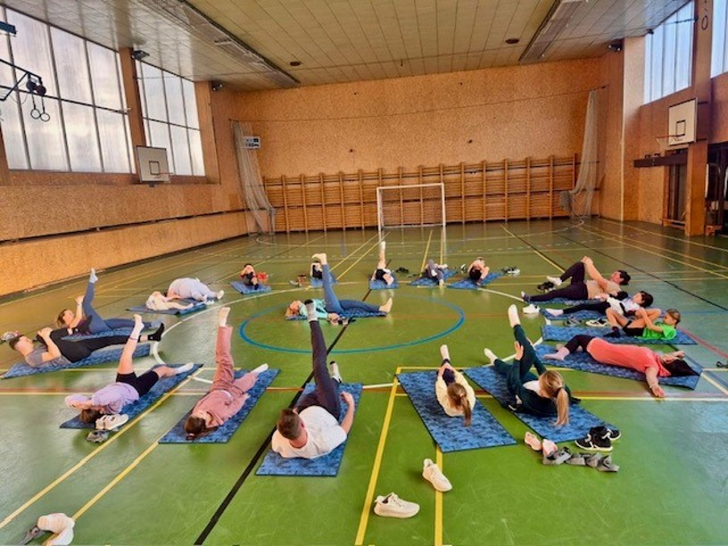 Při jógové rozcvičce si někteří rodiče vzpomněli, že mají svaly, o kterých netušili.