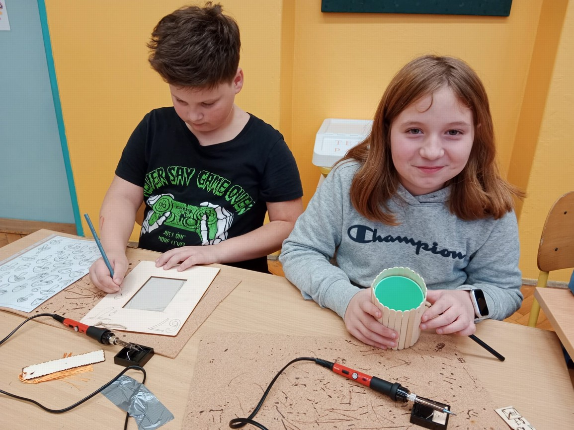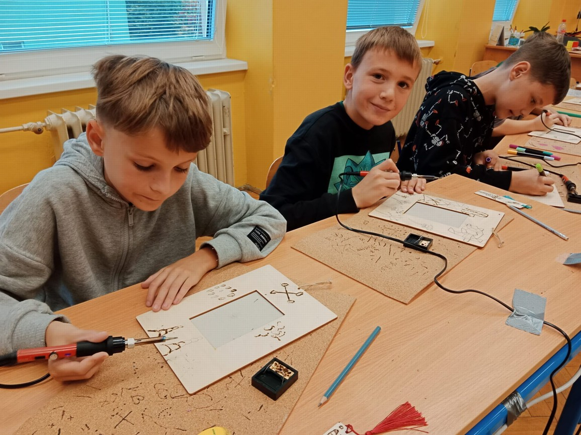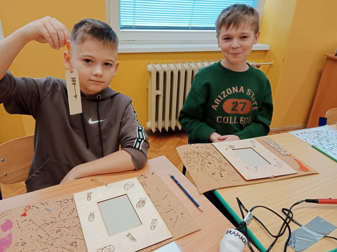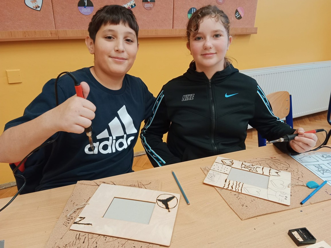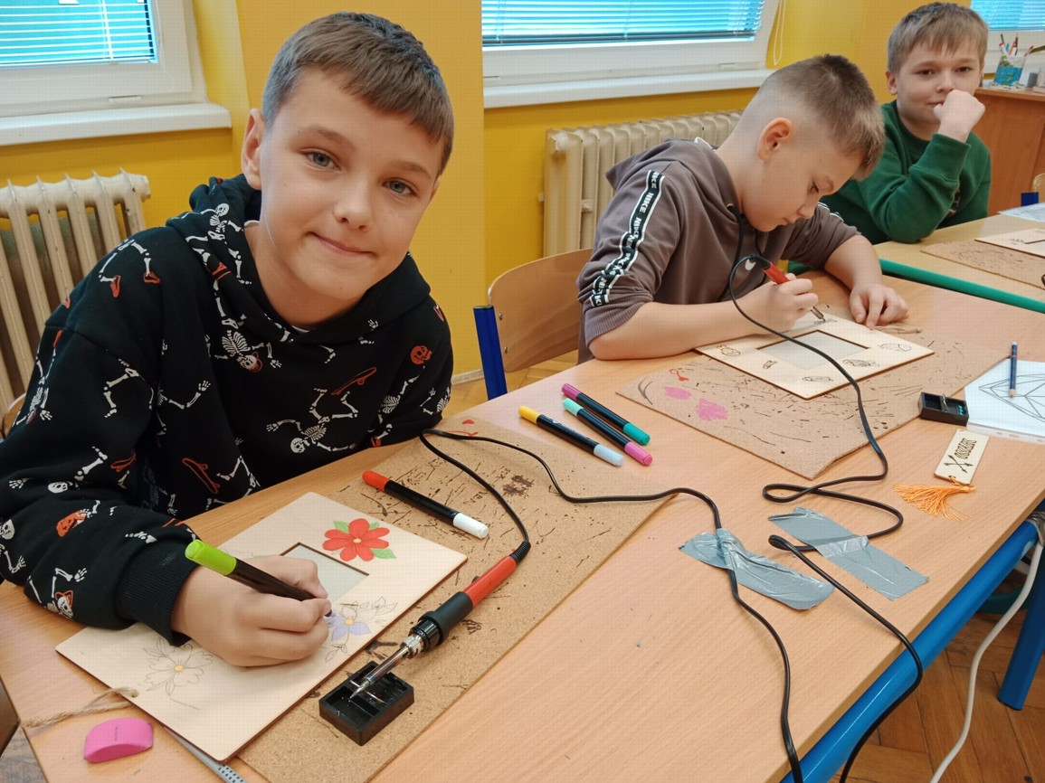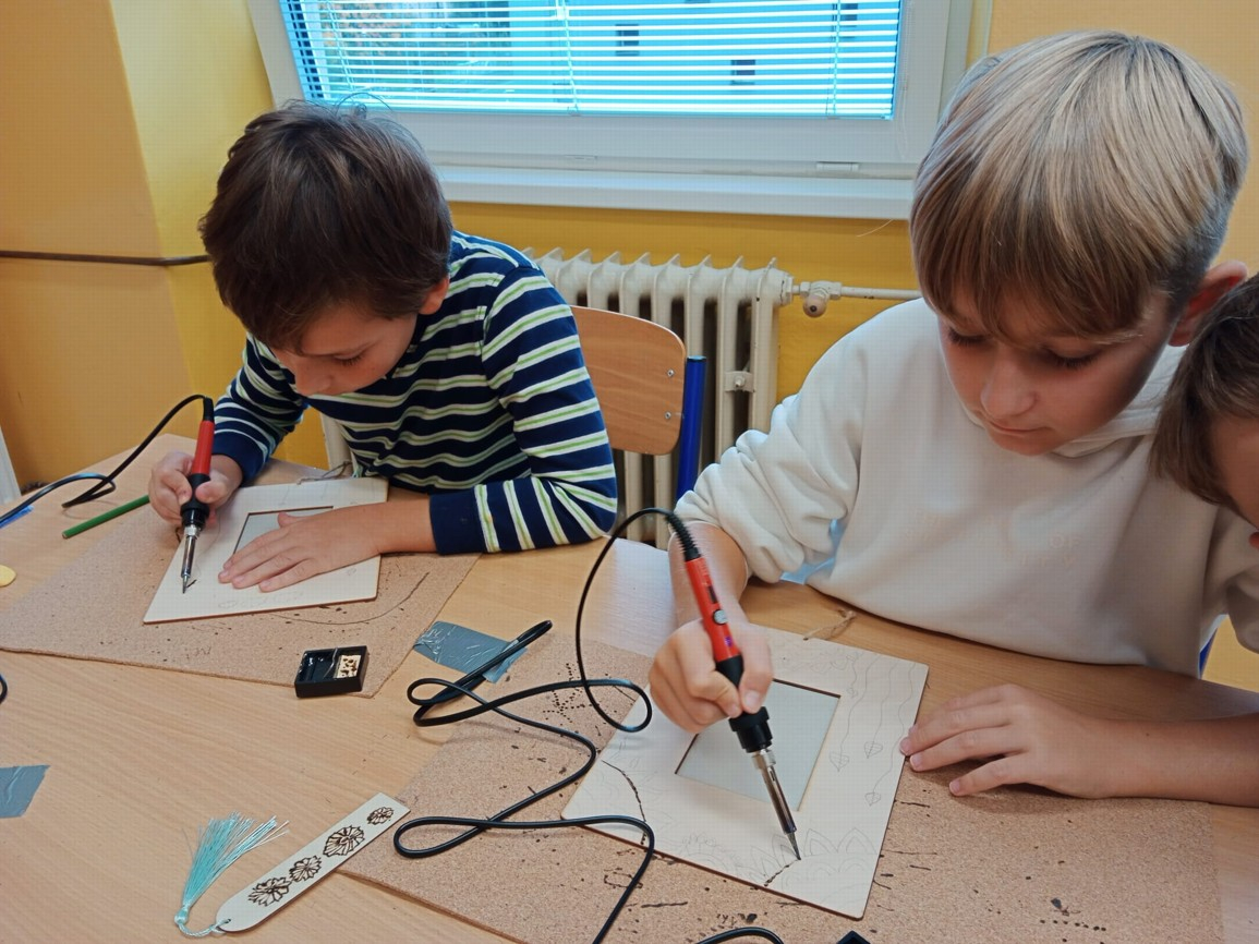 Dnes jsme si vyzkoušeli novou výtvarnou techniku - vypalování do dřeva. Pomocí pájky a speciálních fixů na dřevo jsme si podle předlohy nebo vlastní fantazie vyzdobili záložky, rámečky na fotky a kelímky na tužky. Všechny to moc bavilo.