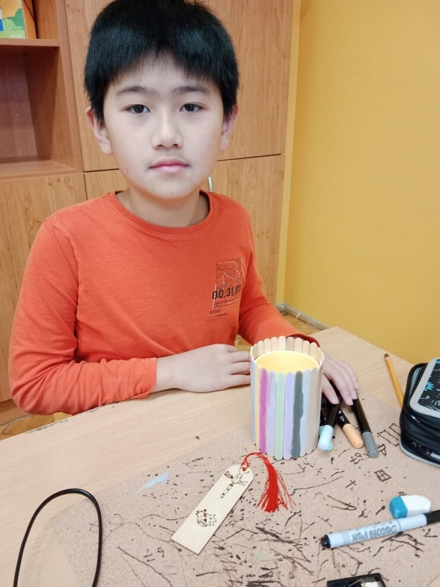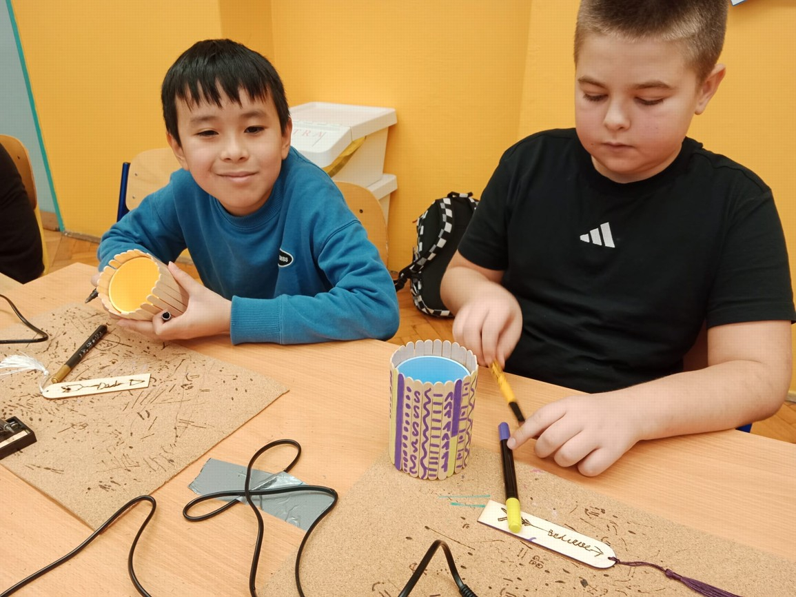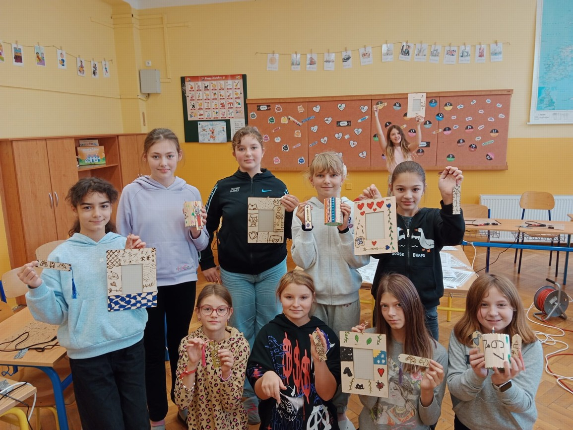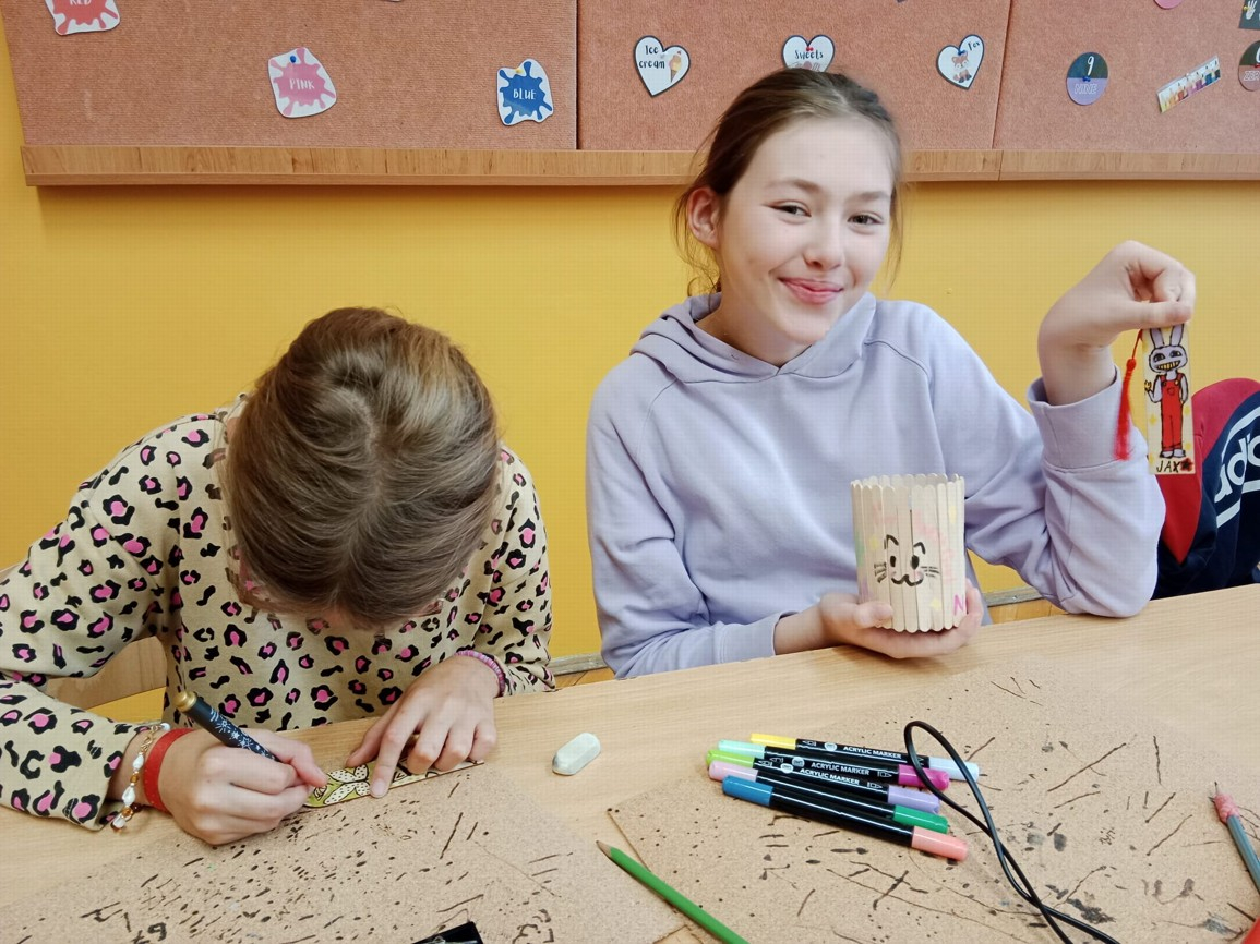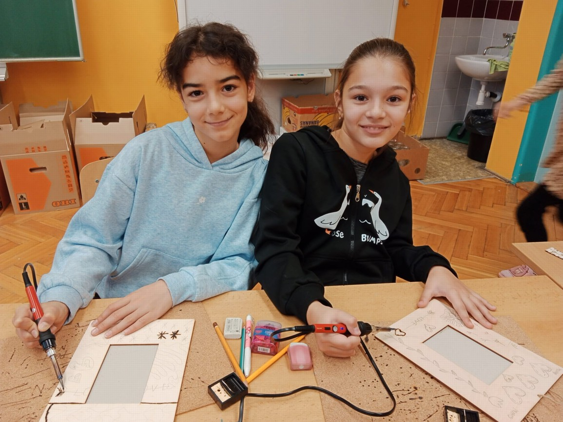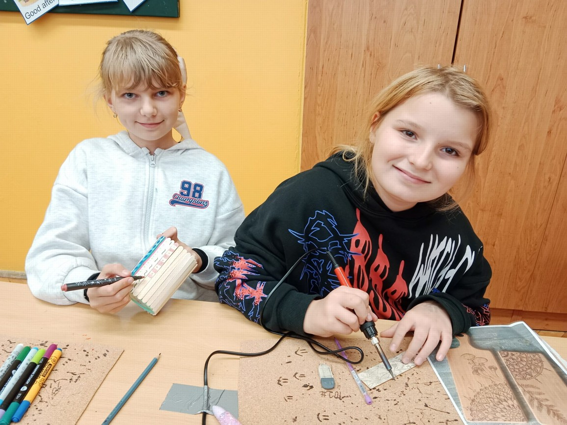 Dnes jsme si vyzkoušeli novou výtvarnou techniku - vypalování do dřeva. Pomocí pájky a speciálních fixů na dřevo jsme si podle předlohy nebo vlastní fantazie vyzdobili záložky, rámečky na fotky a kelímky na tužky. Všechny to moc bavilo.