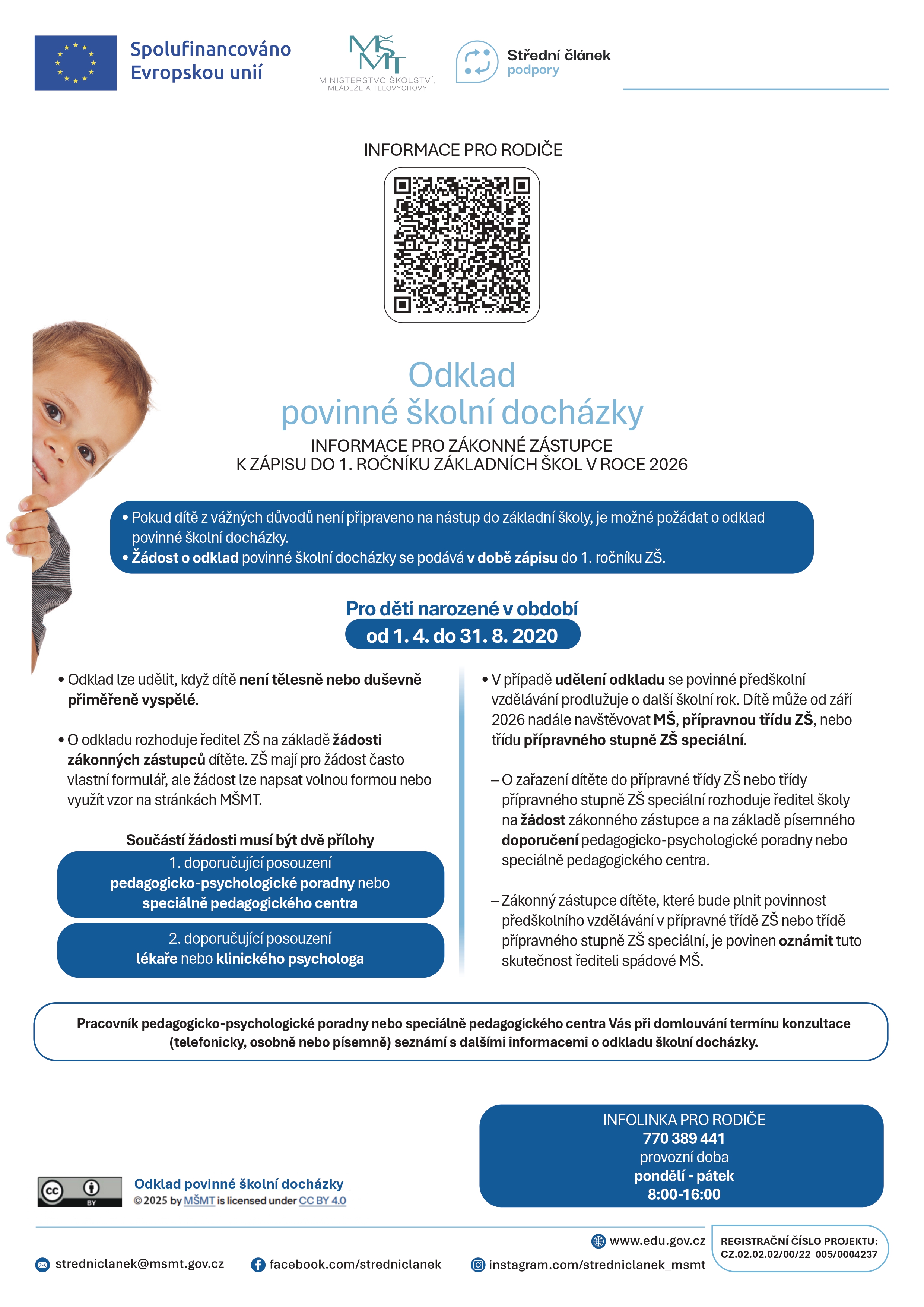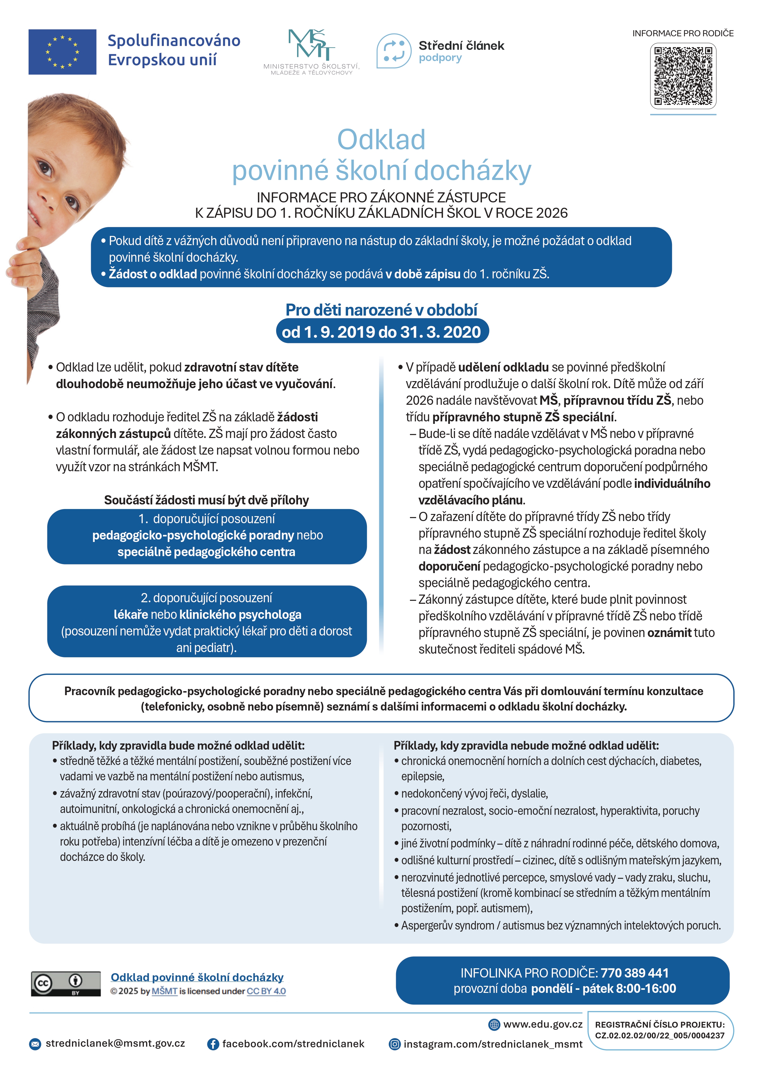 Pokud budete o odklad povinné školní docházky žádat, je nutné v době zápisu předložit posudek příslušného školského poradenského zařízení (pedagogicko-psychologická poradna nebo speciálně pedagogické centrum) a odborného lékaře nebo klinického psychologa.