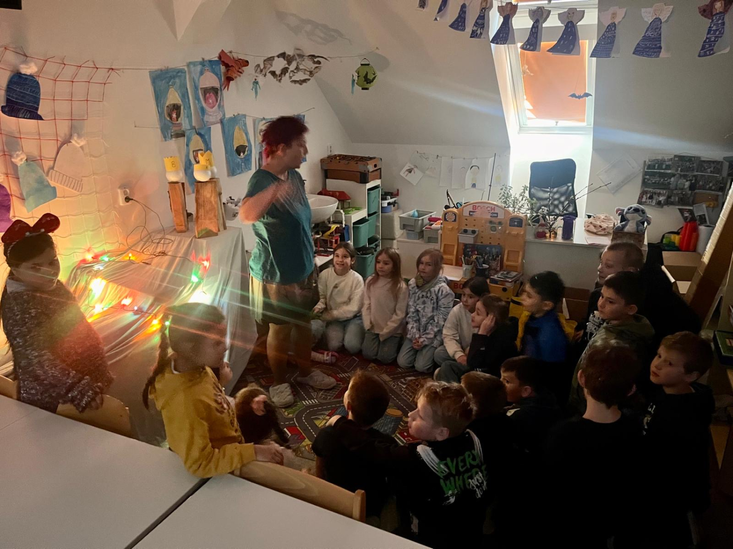 V dalších měsících se dozvídáme něco o zvířátkách a ptáčcích, které u nás v zimě můžeme potkat. Brzká tma přináší možnost pozorování hvězd. Zima je také období karnevalů, Masopustu a našeho pololetního čarodějného sletu po vysvědčení.