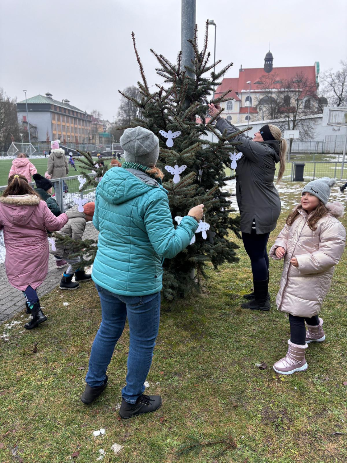 První prosincové pondělí jsme si společně na školní zahradě ozdobili vánoční stromeček, který nám věnovala p.vychovatelka Renča. Celá družinka se po obědě vydala ven a kdo měl zájem, mohl si na náš stromeček pověsit andílka. Společně jsme se vyfotili a ještě si stihli i pohrát.