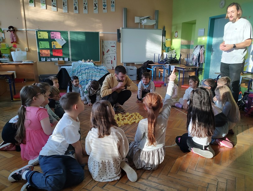 Dnešní den si žáci 1. A užili pořad společnosti Dramacentrum Bezejména s názvem "Kačka". Toto představení seznamuje nejmladší školáčky s prostředím Veseckého rybníka. S příběhem o malé plastové kačence, o ropuše, čolkovi, mlokovi, starém sumci a mihulích, které potřebují čistou vodu, se děti seznamují pomocí maňáskového divadla. Děti samy pomohly donést vajíčka paní čolkové do tůňky, naučily autíčka zpomalit kvůli žábám, káčatům sesbírat rohlíky na hladině, aby je nebolela bříška a nakonec pomohly i plastové kačence najít cestu tam, kam patří. A za tuto pomoc jsme dostali navíc do třídy knížku Kačka, s autorskými ilustracemi, ve které si budeme číst další příběhy. A nejen to! Také jsme dostali pexeso, pracovní listy a hlavně krmení pro kačenky. Nemohli jsme tedy odolat a vyrazili jsme k nedaleké řece, kde jsme kačenky společně nakrmili. Všem se dnešní den moc líbil.