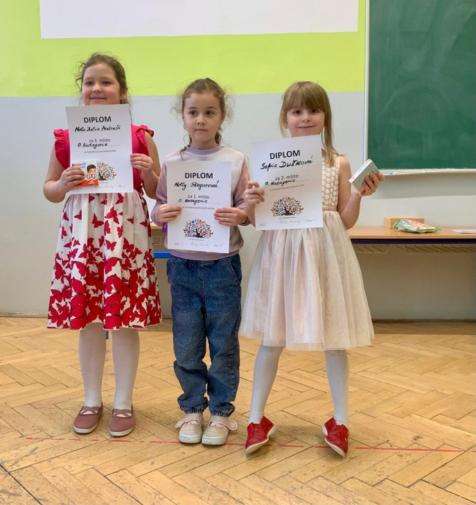 Během měsíce února proběhlo v 1. A třídní recitační kolo. Vybraní žáci se ve čtvrtek účastnili školního kola, kde si poprvé vyzkoušeli, jaké to je recitovat před žáky celé školy. Nellinka získala první místo za recitaci básně "Malovaná pohádka". Oběma recitátorům moc gratulujeme za odvahu a úspěšnou recitaci.