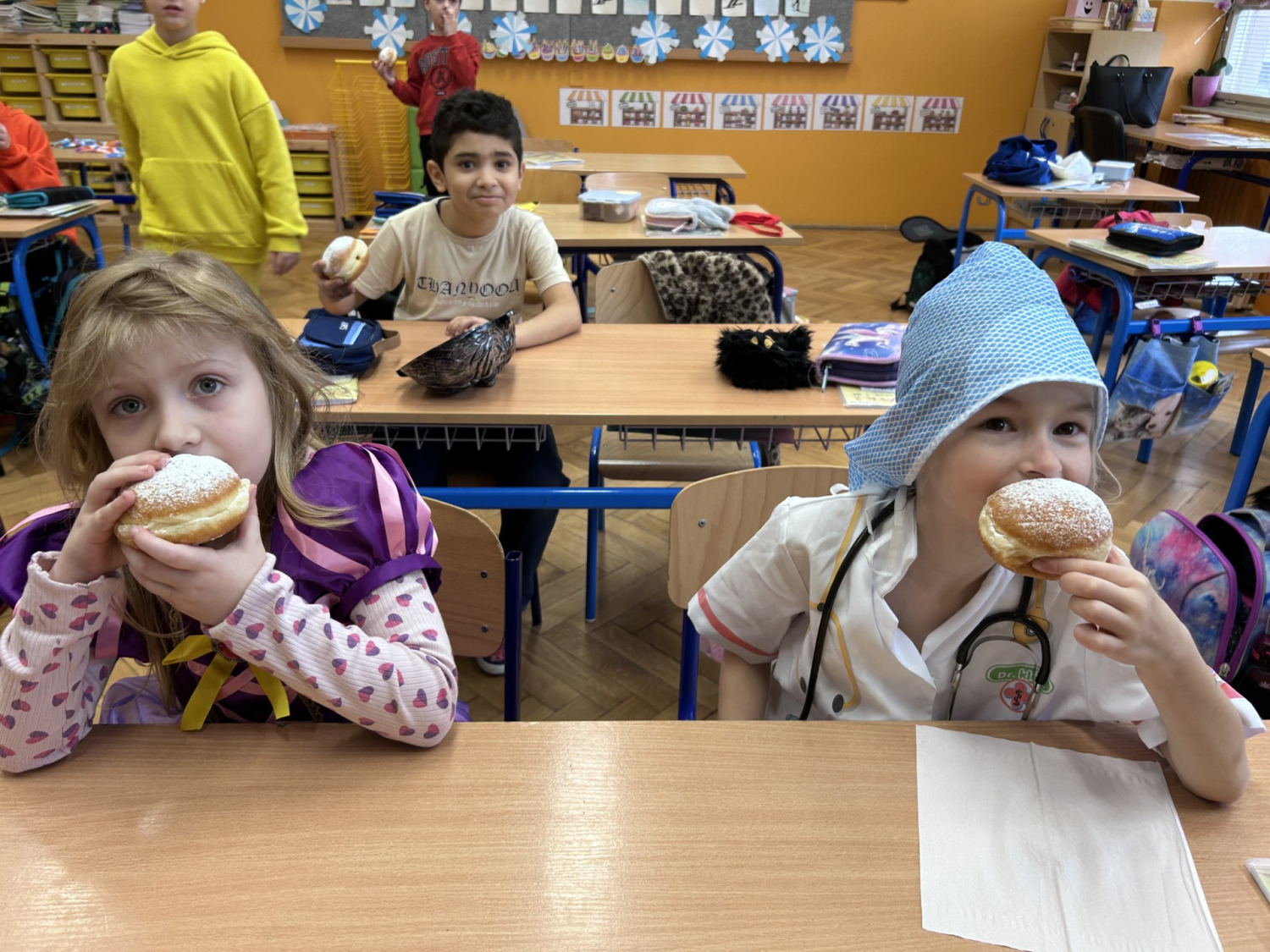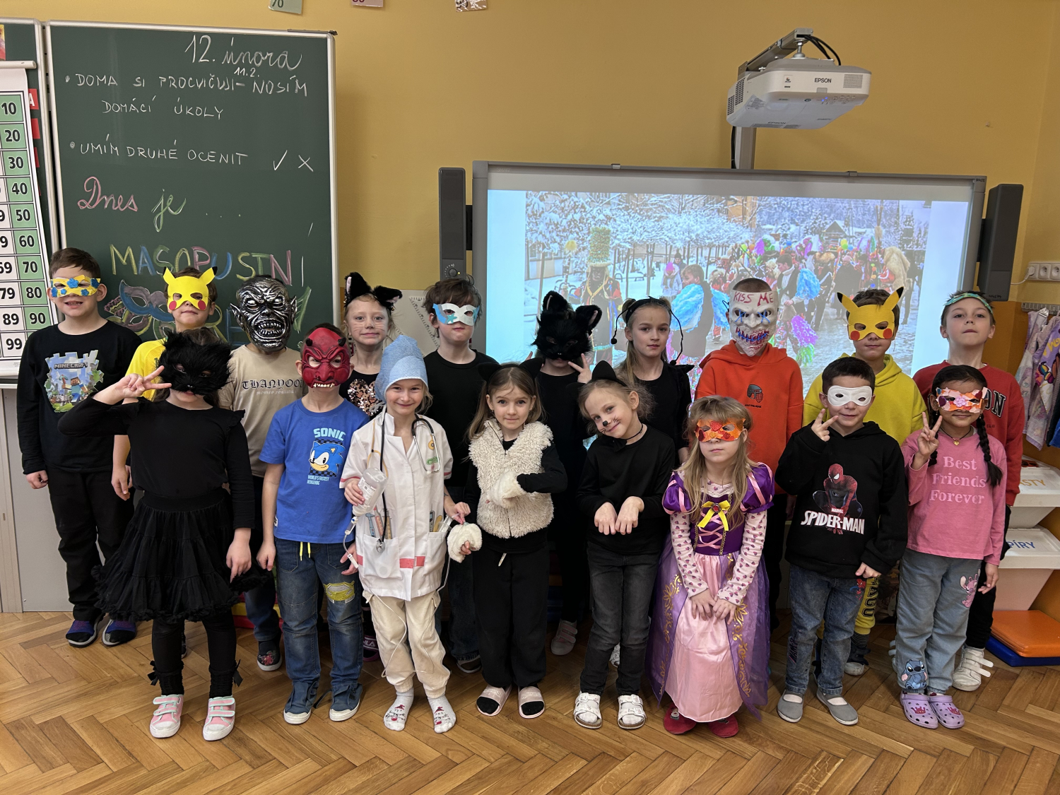 Ve čtvrtek se velká tělocvična zaplnila spoustou pohádkových postav, strašidel, zvířátek a dalších nevídaných bytostí. Vypuklo totiž masopustní veselí a naše třída společně se všemi prvňáčky, druháky a třeťáky tančila v maskách, soutěžila a užila si pěkný společný čas. Nakonec nás ve třídě za odměnu čekaly masopustní koblihy. Děkujeme i čtvrťákům, kteří pro nás připravili stanoviště s úkoly.