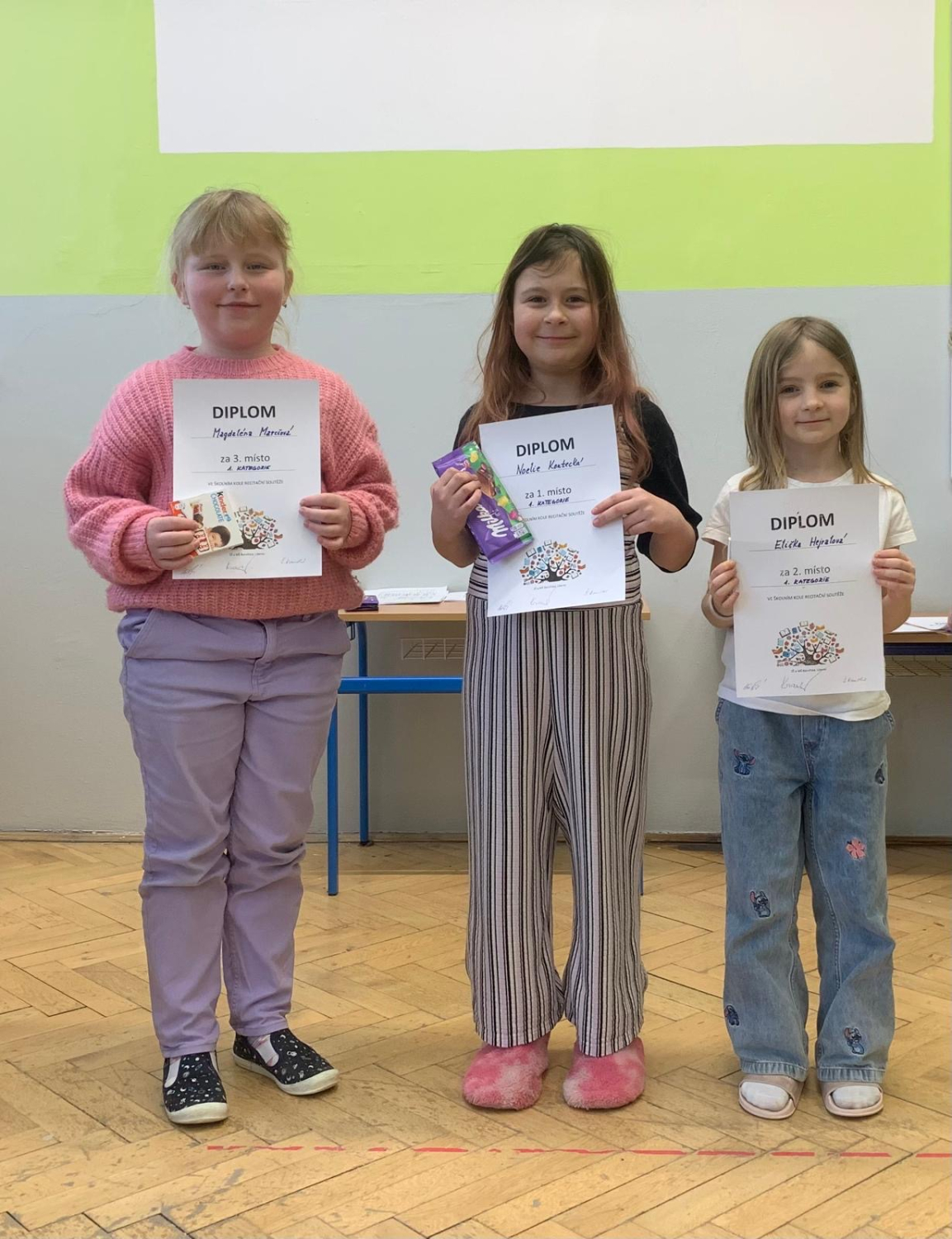 Ve čtvrtek se ve škole konala soutěž v recitaci. Z naší třídy básničky přednášeli Tobík, Kuba a a Eliška. Eliška získala druhé místo ve své věkové kategorii. GRATULUJEME!