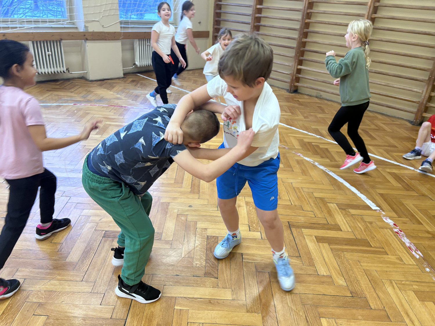 V malé tělocvičně pro nás byl nachystaný program o šikaně. Dozvěděli jsme se, co šikana je a co šikana není. Ale hlavně jsme se naučili bránit, kříčet a utíkat před silnějšími agresory.