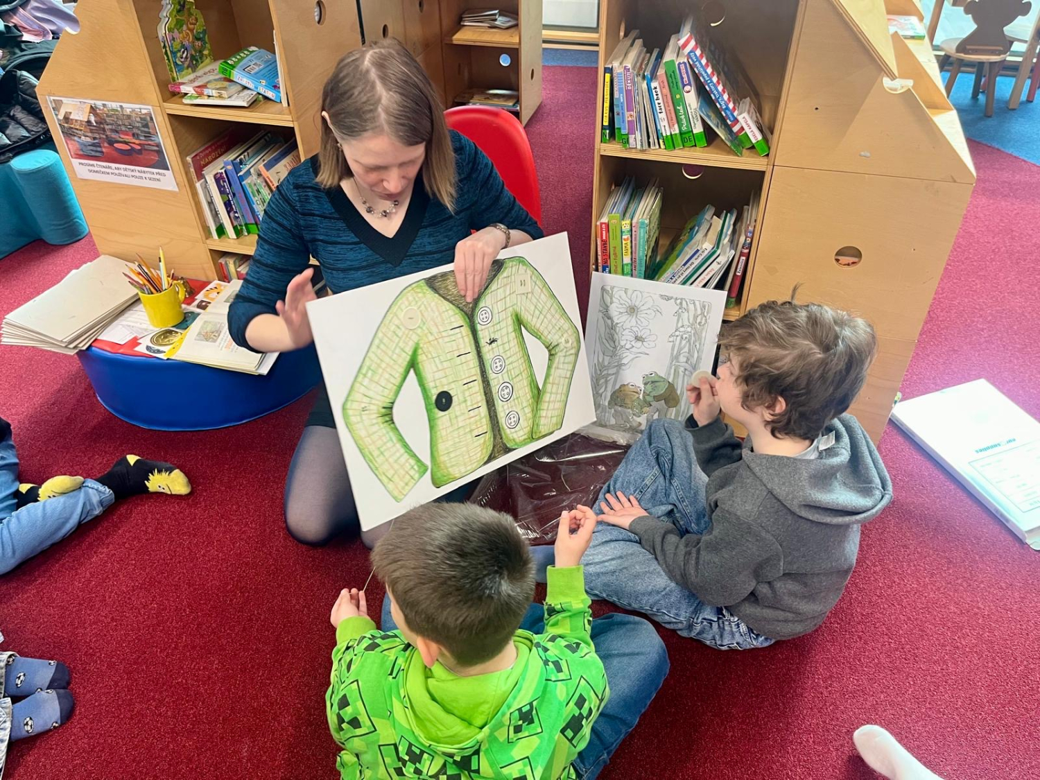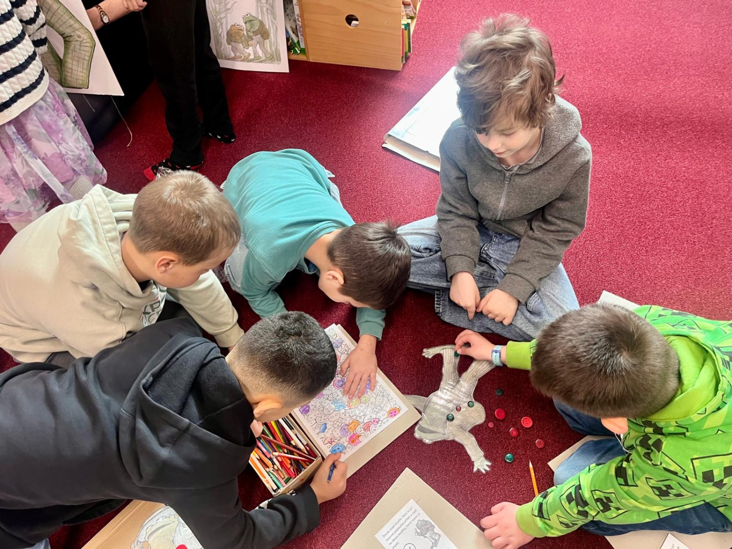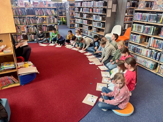 Žáci 2.A dostali příležitost seznámit se s knihou "Kvak a Žbluňk" pomocí příběhu o ztraceném knoflíku. Nejprve si žáci vyzkoušeli přesné vyjadřování při popisování knoflíku, který si každý z nich našel. Při čtení příběhu vyškrtávali podle popisu knoflíky na obrázku, až jim zbyl ten Žbluňkův. Nakonec si zkusili knoflík přišít na Žbluňkův kabátek. Také vybírali barevné knoflíky z krabice rýže, skládali knoflíky na předlohu a vybarvovali je pastelkami.Po programu jsme si ještě užili krátký čas mezi knížkami pro děti 6 -9 let.