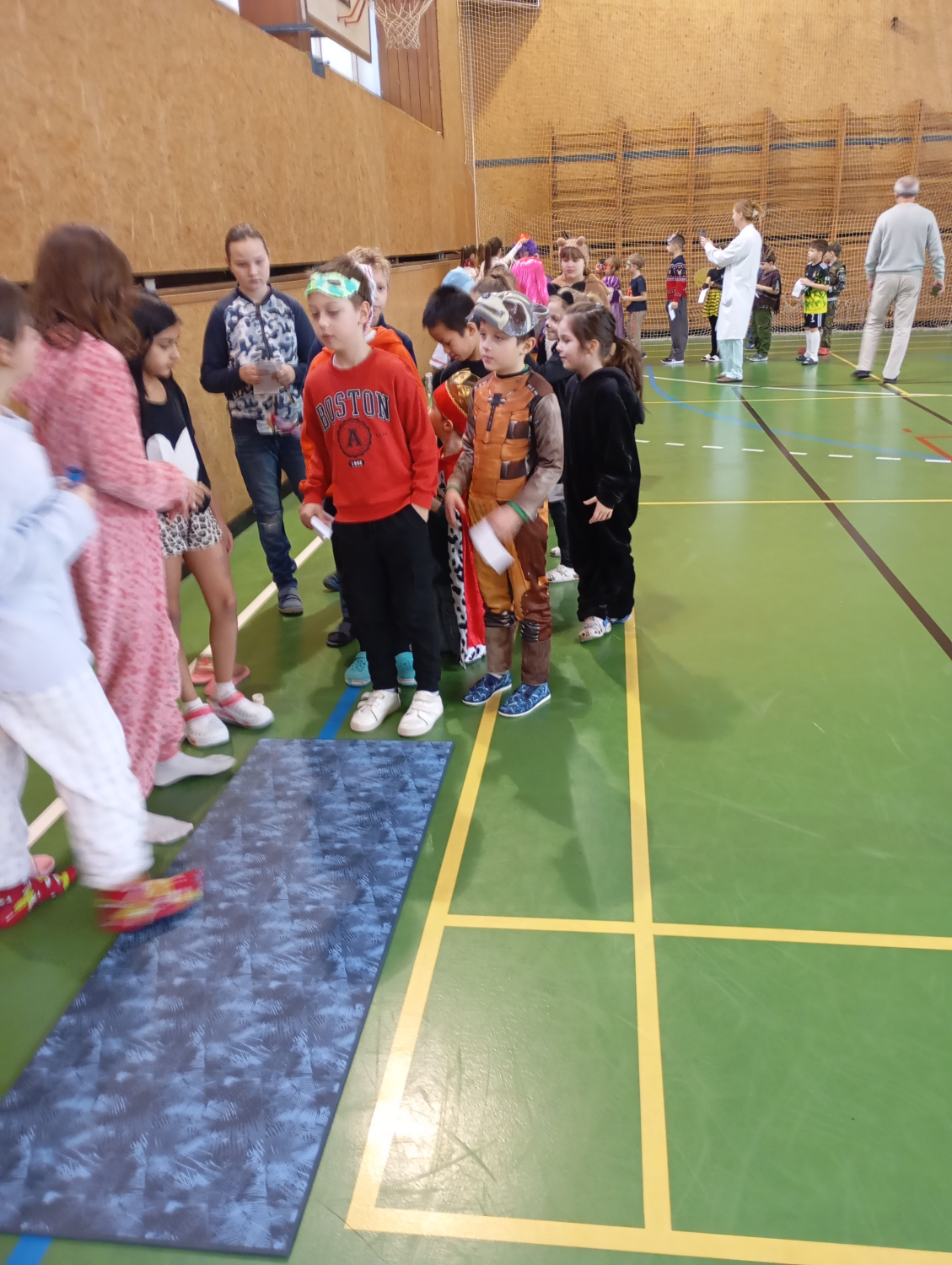 Třídy se sešly ve velké tělocvičně, kde se děti seřadily ke společnému pozdravu.