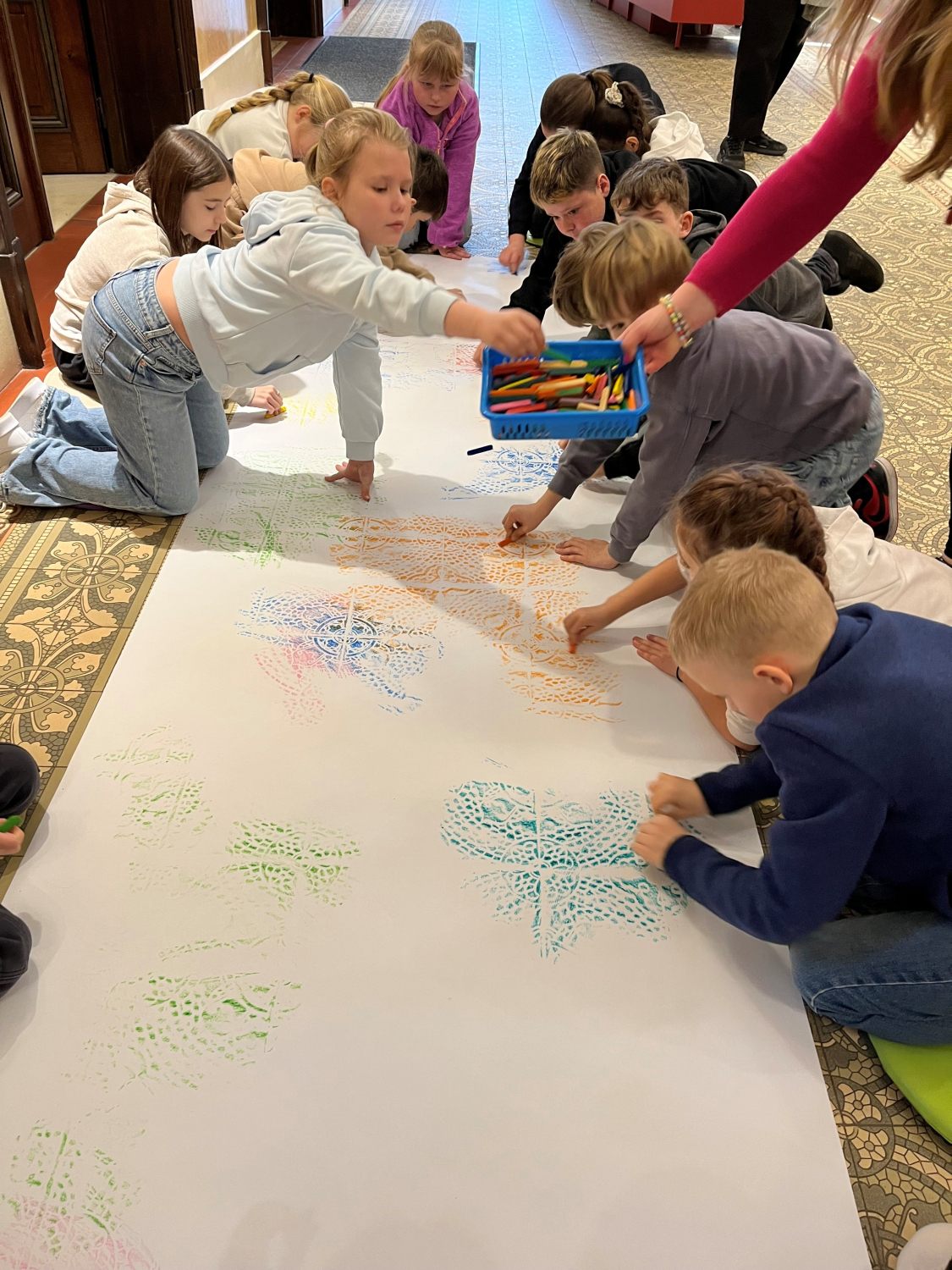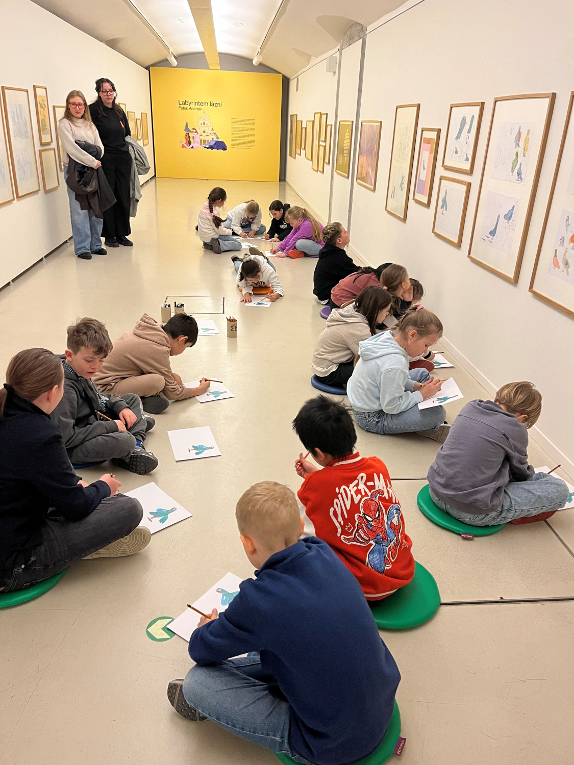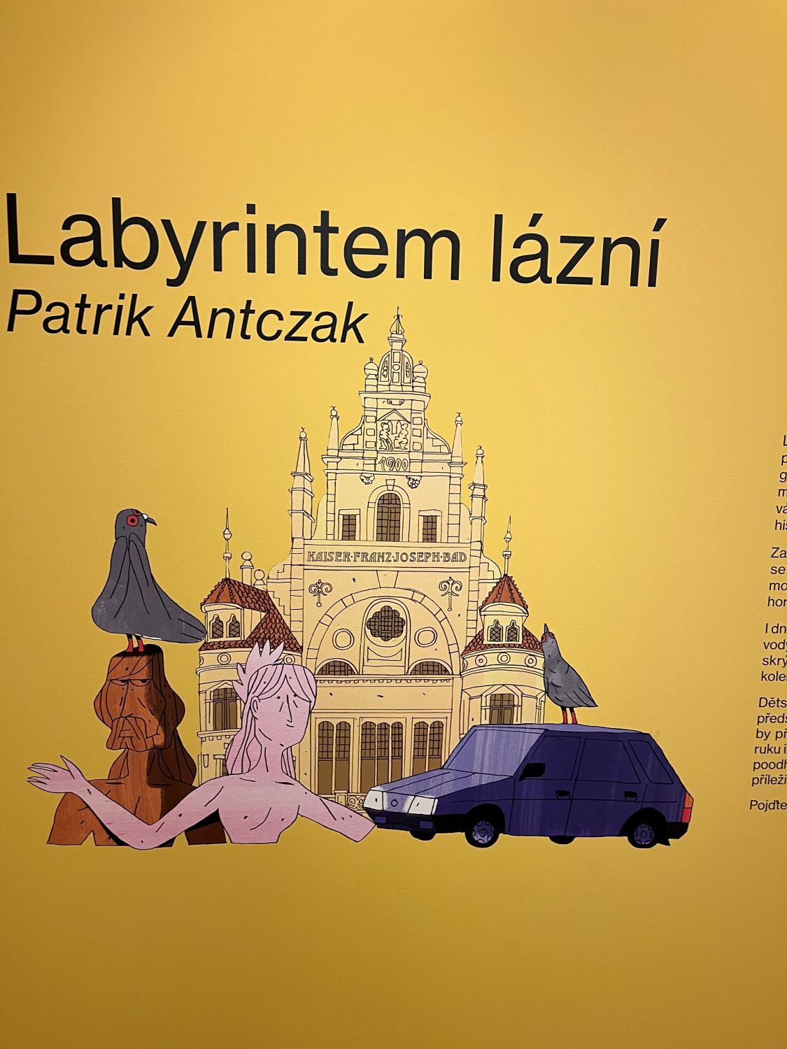 Program Labyrintem Lázní je zážitkově naučným průvodcem po budově galerie, která dříve byla městskými lázněmi. Hned u vchodu se seznámíme se sochami z průčelí, Poseidonem a Amfitrité, bájným božstvem vod a moří, kteří vystupují v knize Labyrintem lázní. Průvodcem nám bude hlavní postava z knihy holub Joe, zvědavý hrdina, který ví, kudy létat, aby objevil ta nejzajímavější zákoutí budovy. Cestou se zaposloucháme do úryvků z knihy a vyzkoušíme si techniku frotáže, díky níž si děti odnesou vlastní otisk lázní. Procházku zakončíme ve výstavě ilustrací z knihy, kde nakoukneme ilustrátorovi přímo pod ruku a prostřednictvím výtvarné aktivity si děti dotvoří ilustrace dle vlastní fantazie.