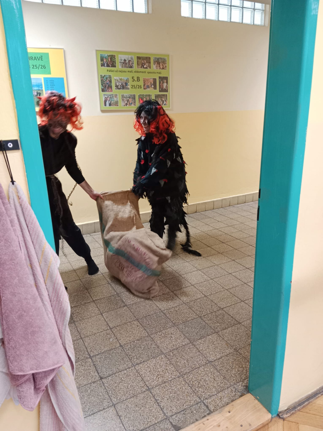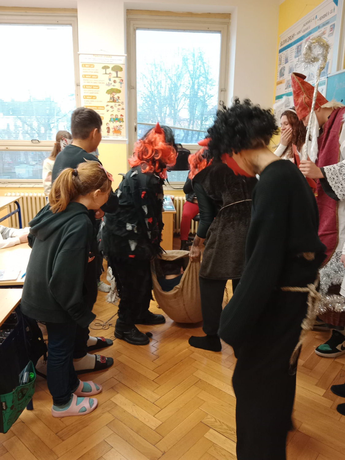 Dnes nás svou návštěvou potěšil Mikuláš se svou družinou. My jsme se ale na čerty připravili, vyrobili jsme si čertí masky a čerty s Mikulášem jsme pěkně vylekali. Někteří žáci skončili u čerta v pytli, Marek se ale nedal a před čerty utíkal, takže jsme byli svědky pořádné honičky mezi lavicemi. Moc jsme se všichni nasmáli.