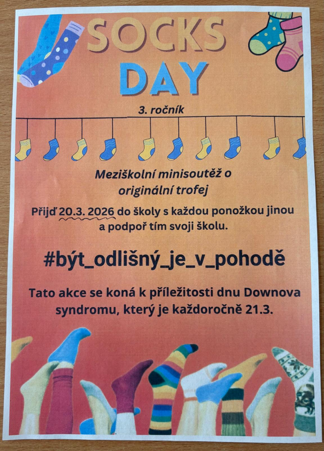 20. 3. se i naše třída připojila k celoškolní akci Socks day, jejímž úkolem bylo připomenout si, že respektovat odlišnost je normální. Velmi malým skutkem, jakým byla nespárovanost ponožek daného dne, jsem si ukázali, že samotná odlišnost neubližuje. Děkuji všem za účast v dané akci.