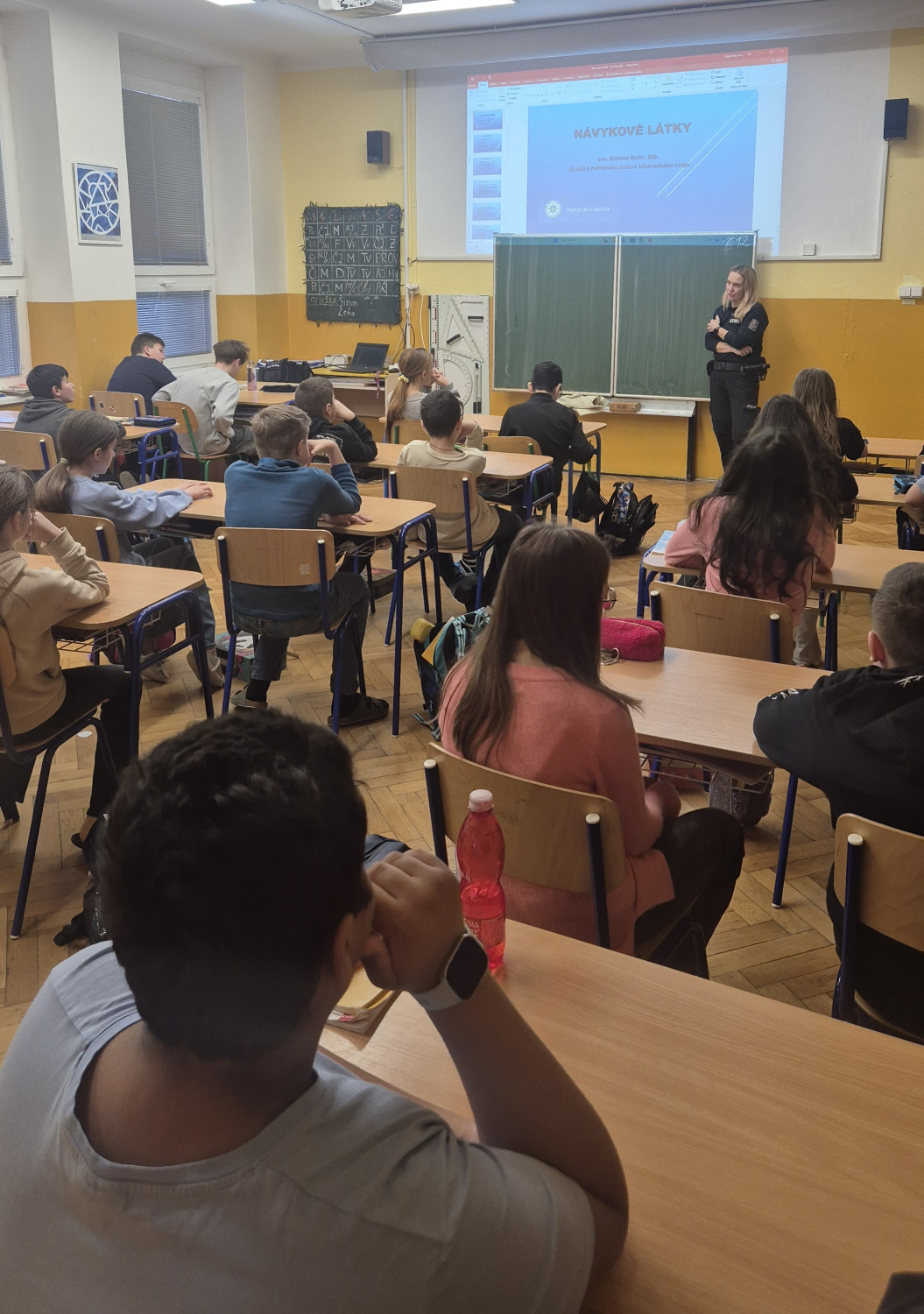 Dnes naši třídu navštívila příslušnice Policie ČR v rámci preventivního programu Drogy a návykové látky. Cílem toho programu bylo seznámit žáky s problematikou a riziky návykových látek. Přednáška byla zaměřena na prevenci, důsledky užívání drog a jejich dopad na zdraví i běžný život mladých lidí.